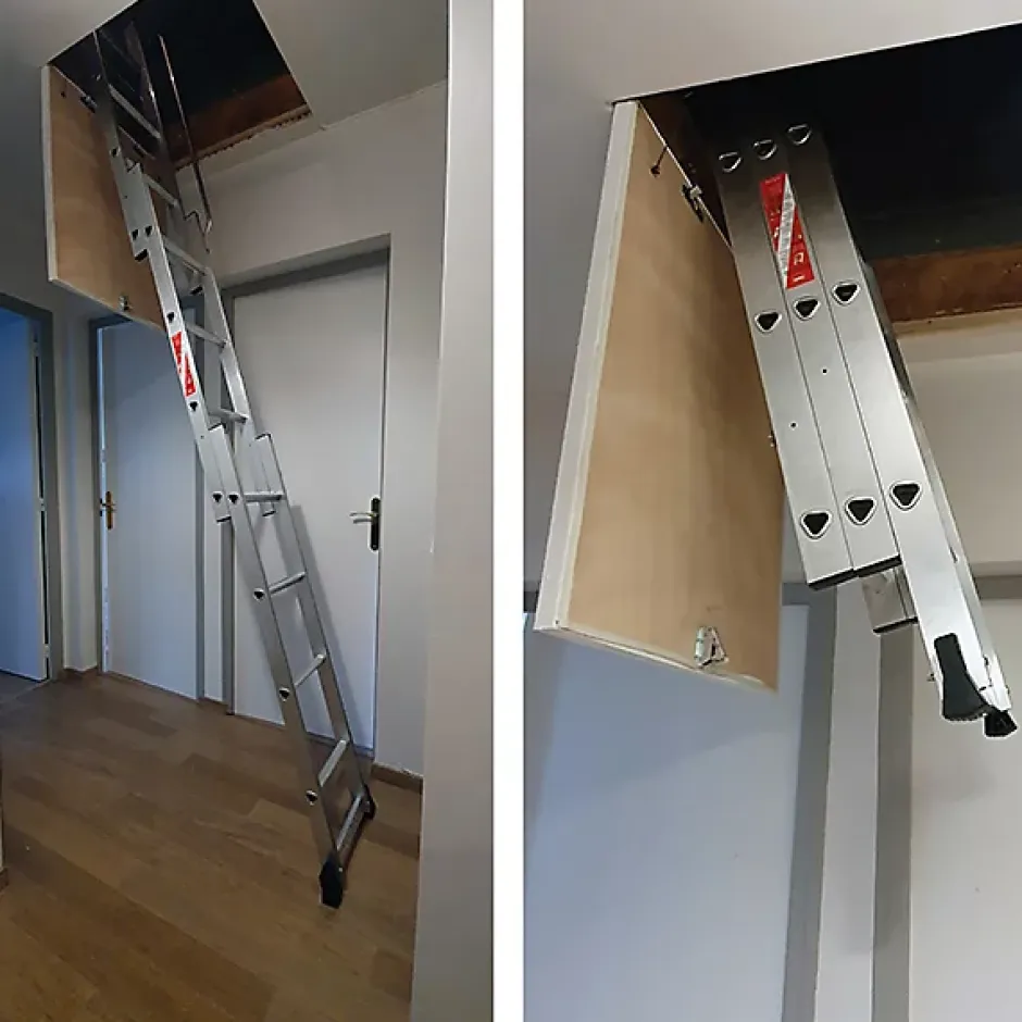 MATERIEL SANS TRAPPE- Echelle escamotable parfaite pour des travaux de rénovation.- Création de la trappe par vos soins en fonction de vos dimensions.- Pas besoin d’agrandir la dalle de votre plafond.ACCES AU GRENIER- Accès au grenier même lorsque l’ouverture au plafond est limitée- Accès possible même dans les petits espace comme les couloirsMANIPULATION SIMPLE- Echelle légère et peu encombrante facile à manipuler- Ouverture facile avec perche de manoeuvre fournie- Fermeture en faisant coulisser l’échelle à l’étage- Merci de vérifier que la place nécessaire soit disponible SECURITE- Echelons de 30 x 30 x 30mm- Echelons sûrs et confortables en forme triangulaire : surface de pose du pieds plane – Rampe d’accès pour la sécurité de l’utlisateur- Echelle escamotable coulissante de 3 plans de 4 barreaux chacun.MONTAGE FACILE- Installation rapide par un professionel ou par un bricoleur – Matériel livré avec notice de pose détaillée.Les accessoires et les options ne sont pas fournis avec le matériel, veuillez nous contacter pour plus de renseignements