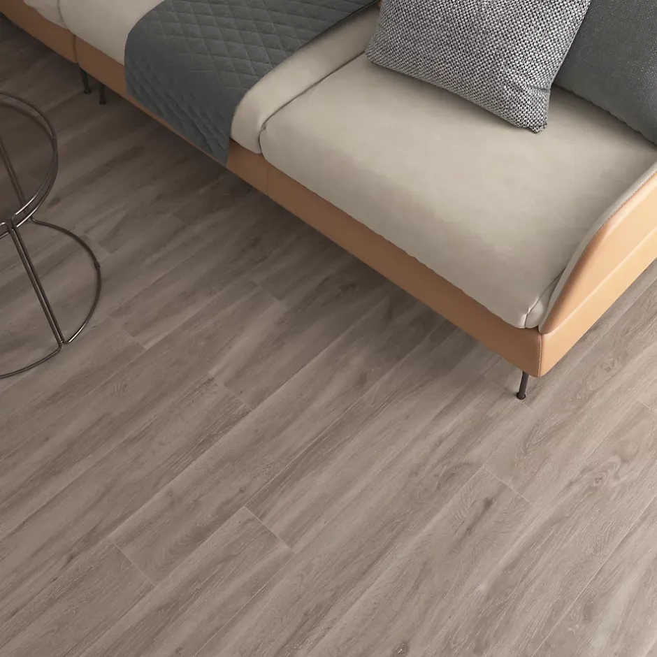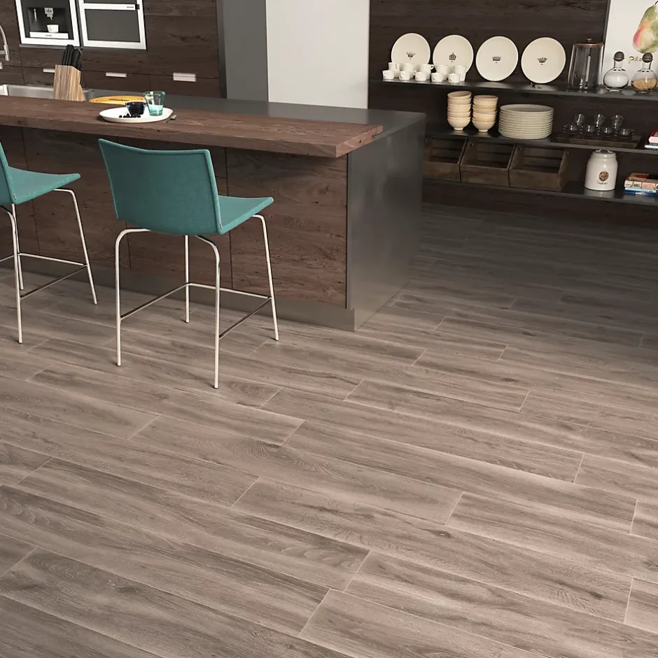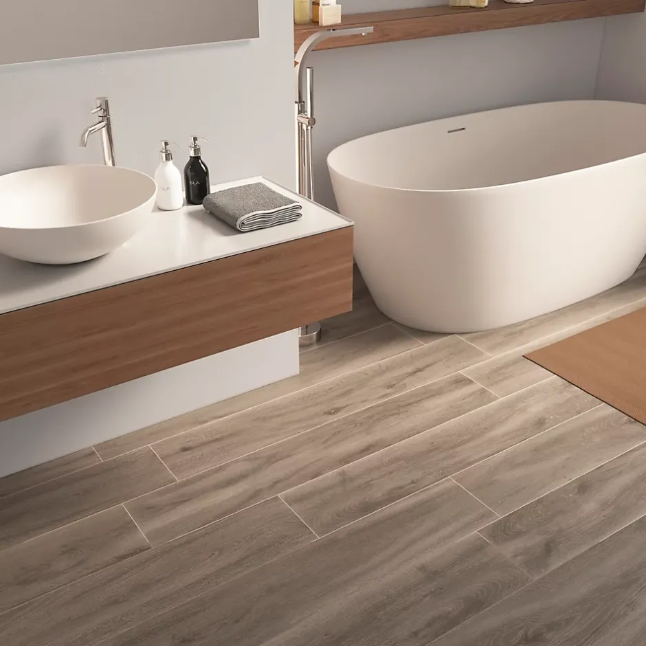- L’aspect bois chaleureux combiné à la facilité d’entretien du carrelage offre un intérieur esthétique et pratique.