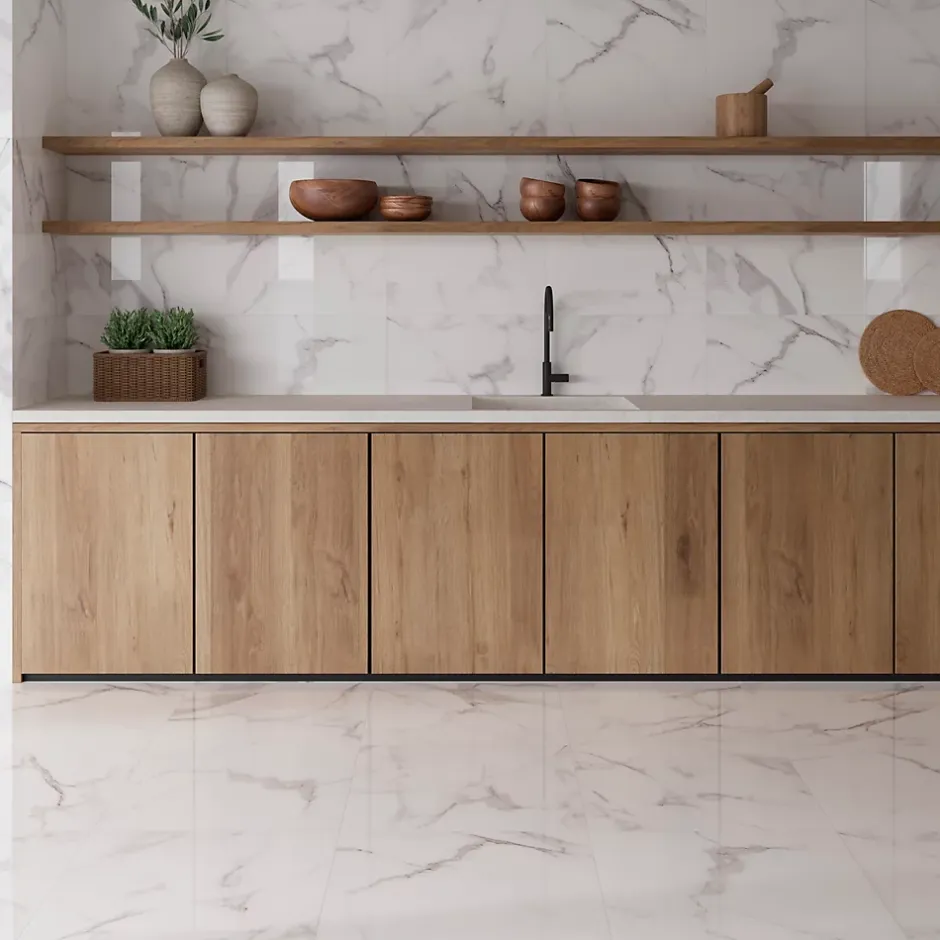 Carrelage sol et mur intérieur en grès effet marbre blanc brillant L. 60 x 60 cm x ép.8,5 mm, Ecoceramic Aria
