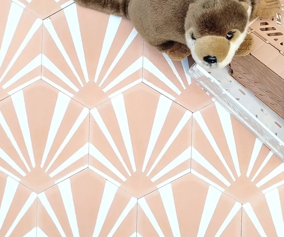 Notre modèle Gatsby est inspiré de l’époque des années folles. Ce modèle de carreau de ciment aux nuances rose poudré et blanc apportera à votre intérieur élégance, sophistication et une exubérance certaine.