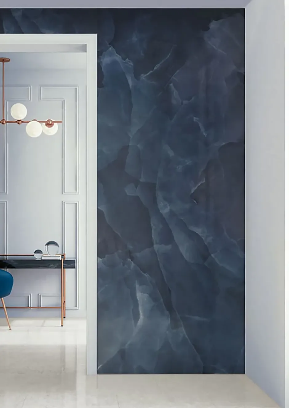 Onyx est le revêtement parfait pour donner aux pièces de la maison le charme intemporel de la pierre d’onyx avec une touche de modernité. Les transparences et les couleurs précieuses qui caractérisent cette essence se retrouvent dans une touche contemporaine de cette collection . En réduisant les joints, ces dalles aux couleurs Blanc et Bleu assurent des performances esthétiques maximales et une grande polyvalence.