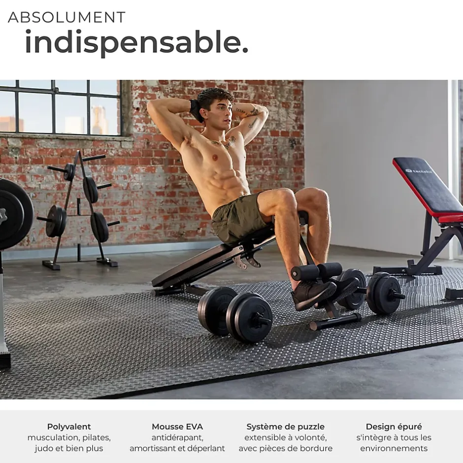 Ensemble de 12 Dalles Carrées EVA – Tapis de sol, Tapis de Sport, Tapis de Gymnastique, Tapis de Yoga, Tapis Puzzle Antidérapant en Mousse 61 cm X 61 cm TECTAKE. Vous recherchez un tapis de sol en mousse adaptable, fonctionnel, polyvalent et résistant. Ce tapis de sol épais composé de 12 pièces dentelées (Type Puzzle) protège vos sols selon vos différents besoins. Il est très résistant à l’usure et peut-être utilisé dans de nombreuses situations pour protéger, isoler vos sols. Dans une salle de sport, il protège efficacement vos sols contre les rayures des appareils de fitness ou de musculation. Il peut également servir comme tapis d’entrainement, de gymnastique, de sol ou de yoga et protège vos sols de la transpiration. Dans une buanderie ou dans une salle de bain, ce tapis de sol en mousse atténuera le bruit de votre machine à laver ou de votre sèche-linge. Il est idéal pour réaliser une isolation acoustique. Les dalles individuelles peuvent être facilement assemblées et ajustées au sol grâce à leurs bordures dentelées. Le tapis de sol est extrêmement facile à entretenir car il peut être nettoyé à l’aide d’un chiffon humide.