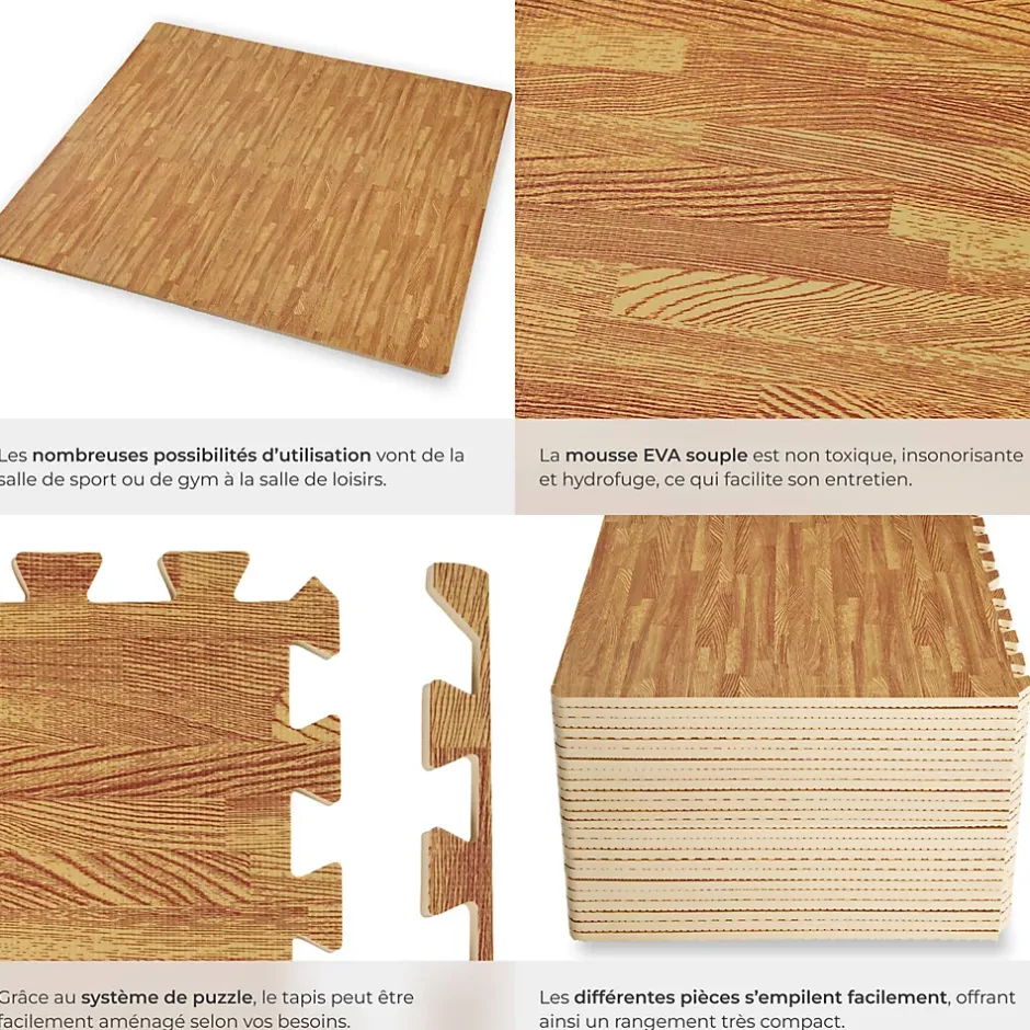 - Points Forts:Protège vos sols des rayures. Dalles individuelles assemblable au sol au moyen de bordures dentelées. Hydrofuge (résistant à l’humidité). Isolant thermique. Isolant acoustique (Atténue le bruit). Surface rainurée antidérapante. Peut être ajusté selon vos besoins. Résistant. Nettoyage facile.