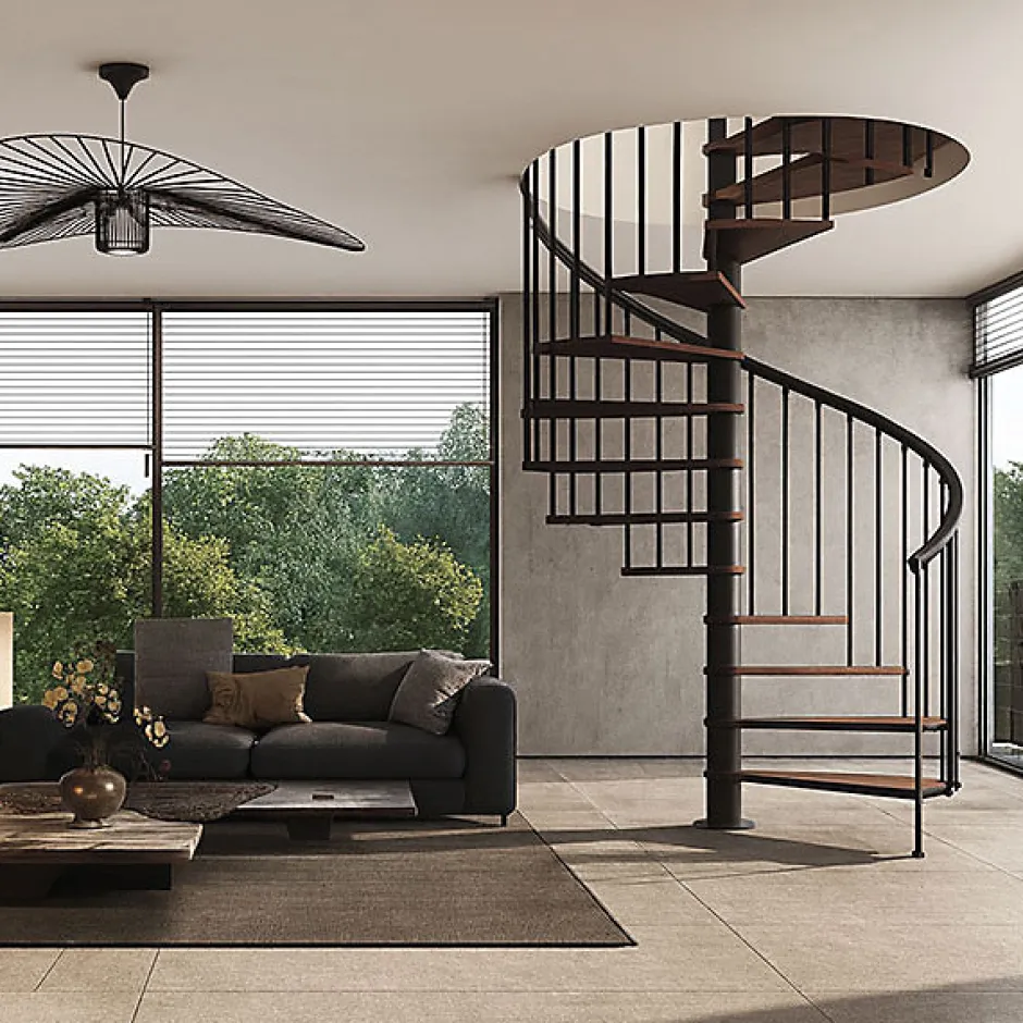 ESCALIER DESIGN- Le bois massif de hêtre est idéal pour créer une ambiance chaleureuse à votre intérieur et votre décoration.- L’acier de la structure apporte une touche de modernité et contraste avec le bois massif pour un style unique et une grande solidité.- Escalier d’intérieur en bois massif de hêtre d’un diamètre confortable de 1.20 mètres.- L’escalier hélicoïdal offre un accès sécurisé et confortable à un étage dans une maison individuelle ou dans un appartement en duplex- Aménagement ou rénovation d’une habitation l’escalier hélicoïdal saura s’adapter à votre intérieur.HAUTEUR REGLABLE- Régler la hauteur en faisant varier le nombre d’entretoise sur la structure au moment du montage.- Espace entre marches réglable de 20.5 à 24cm, conseillée 22cm pour une utilisation confortable.- Pour une configuration spécifique, n’hésitez pas à nous adresser vos côtes (hauteur sous plafond et épaisseur de dalle) et photos de l’emplacement de l’escalier.STRUCTURE ET MAIN-COURANTE- Structure en acier avec une peinture mate et anti-rayures, coloris anthracite (RAL anthracite 03).- Traitement avec une poudre époxy qui ne dégage pas de solvants toxiques.- Rampe avec des colonnes verticales en acier coloris anthracite (RAL anthracite 03), similaire à la structure.- Main-courante en moplen, coloris anthracite (RAL anthracite 03), similaire à la structure.MARCHES HAUTE QUALITE- La conception des marches offre une grande résistance mécanique et une stabilité élevée pour un escalier avec une grande durée de vie.- Marches couleur bois (RAL Noyer 25) avec 3 couches de peinture étanche.- Marches en bois massif de hêtre d’une épaisseur de 40 mm, sans noeuds ni fissures.- Nombre de marches palier inclus.TREMIE- Le palier d’arrivé s’adapte en fonction de la trémie, recoupable en fonction d’une trémie ronde ou carrée.- Trémie au moins 5