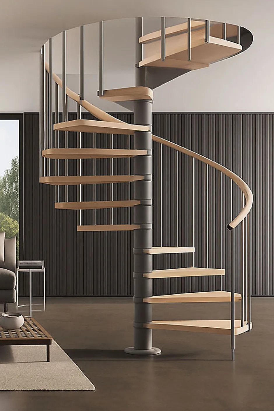 ESCALIER DESIGN- Le bois massif de hêtre est idéal pour créer une ambiance chaleureuse à votre intérieur et votre décoration.- L’acier de la structure apporte une touche de modernité et contraste avec le bois massif pour un style unique et une grande solidité.- Escalier d’intérieur en bois massif de hêtre d’un diamètre confortable de 1.40 mètres.- L’escalier hélicoïdal offre un accès sécurisé et confortable à un étage dans une maison individuelle ou dans un appartement en duplex- Lors de l’aménagement ou la rénovation d’une habitation l’escalier hélicoïdal saura s’adapter quel que soit votre intérieur et la hauteur à franchir.HAUTEUR REGLABLE- Régler la hauteur en faisant varier le nombre d’entretoise sur la structure au moment du montage.- Espace entre marches réglable de 20.5 à 24cm, conseillée 21cm pour une utilisation confortable.- Pour une configuration spécifique, n’hésitez pas à nous adresser vos côtes (hauteur sous plafond et épaisseur de dalle) et photos de l’emplacement de l’escalier.STRUCTURE ET MAIN-COURANTE- Structure en acier avec une peinture mate et anti-rayures, coloris gris (RAL Gris 01).- Traitement avec une poudre époxy qui ne dégage pas de solvants toxiques.- Rampe avec des colonnes verticales en acier coloris blanc coloris gris (RAL Gris 01), similaire à la structure.- Main-courante en moplen, coloris gris (RAL Gris 01), similaire à la structure.MARCHES HAUTE QUALITE- La conception des marches offre une grande résistance mécanique et une stabilité élevée pour un escalier avec une grande durée de vie.- Marches couleur naturel (RAL Naturel 12) avec 3 couches de peinture étanche.- Marches en bois massif de hêtre d’une épaisseur de 40 mm, sans noeuds ni fissures.- Nombre de marches palier inclus.TREMIE- Le palier d’arrivé s’adapte en fonction de la trémie, recoupable en fonction d’une trémie ronde ou