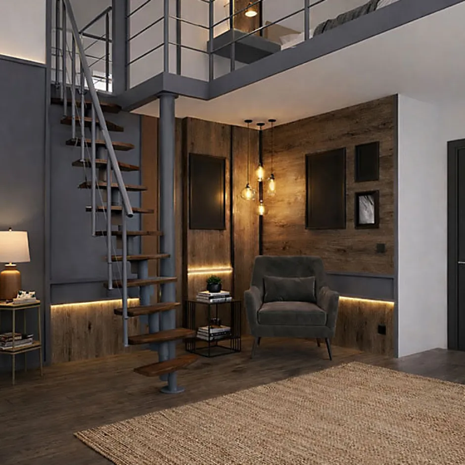 ESCALIER DESIGN- L’escalier d’intérieur droit en bois et acier est une solution simple et design pour accéder à un étage ou une mezzanine- Le mélange du bois massif et de l’acier offre des contemporaine à votre intérieur.- Peut s’intégrer dans un duplex au style Loft ou dans une maison moderne.- Sa conception droite permet d’optimiser l’espace en réalisant un espace de rangement ou de décoration sous l’escalierESPACES REDUITS- Escalier d’intérieur d’une largeur de 0.60 mètres pour des habitations avec des espaces réduits.- Passer d’un étage à un autre ou un espace en hauteur comme dans des appartements parisiens qui ont une surface réduite.HAUTEUR REGLABLE- Régler la hauteur en faisant varier la hauteur de la fixation sur la structure au moment du montage.- Pour une configuration spécifique, n’hésitez pas à nous adresser vos côtes (hauteur sous plafond et épaisseur de dalle) et photos de l’emplacement de l’escalier.STRUCTURE ET RAMPE GRISE- Structure en acier peint par poudrage et rails inférieurs de la rampe en acier inoxydable.- La rampe garantit un accès sécurisé lors de la montée et de la descente.- Rampe avec des poteaux reliés entre eux par 3 lisses rigidesMARCHES COULEUR NOYER- Marches en bois de hêtre avec une finition laqué, couleur noyer.- Designe des marches qui permet un gain de place au sol.MAIN-COURANTE PVC- Main-courante en PVC- Garantie un accès sécurisé lors de la montée et de la descenteINSTALLATION FLEXIBLE- Escalier qui peut se ligne droite ou en le tournant légèrement vers la gauche ou la droite.- Choix d’installation lors du montage.- Permet d’éviter un obstacle : mur, meuble, ouverture de porte…TREMIE- Trémie minimum requise : 125 x 65cm- La hauteur de passage entre l’escalier et le plafond doit être au minimum de 220 cm, pour un passage