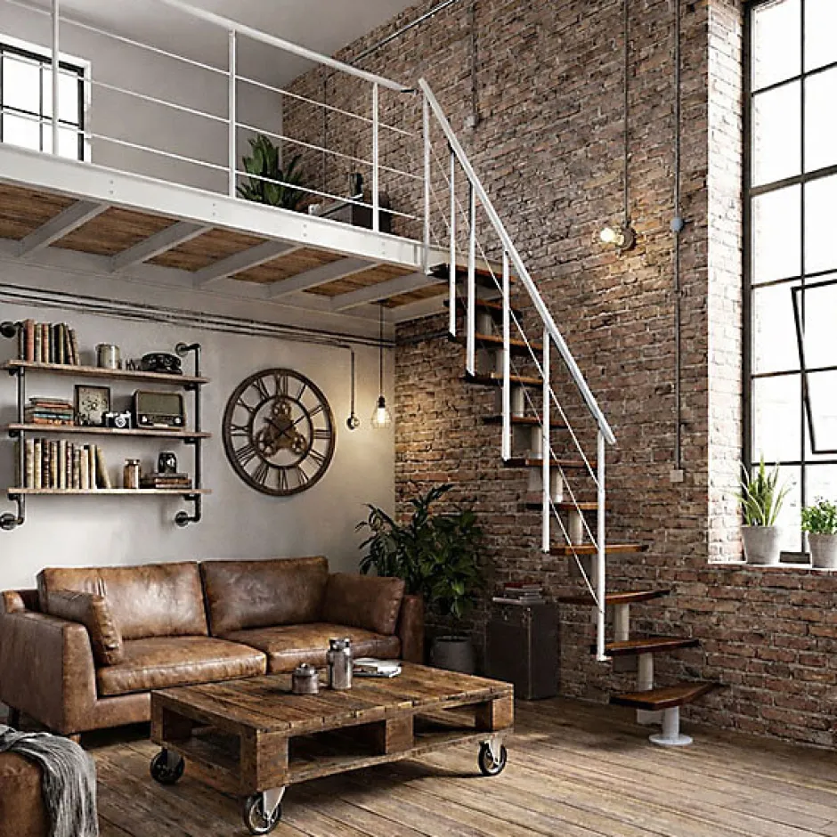 ESCALIER DESIGN- L’escalier d’intérieur droit en bois et acier est une solution simple et design pour accéder à un étage ou une mezzanine- Le mélange du bois massif et de l’acier offre des contemporaine à votre intérieur.- Peut s’intégrer dans un duplex au style Loft ou dans une maison moderne.- Sa conception droite permet d’optimiser l’espace en réalisant un espace de rangement ou de décoration sous l’escalierESPACES REDUITS- Escalier d’intérieur d’une largeur de 0.60 mètres pour des habitations avec des espaces réduits.- Passer d’un étage à un autre ou un espace en hauteur comme dans des appartements parisiens qui ont une surface réduite.HAUTEUR REGLABLE- Régler la hauteur en faisant varier la hauteur de la fixation sur la structure au moment du montage.- Pour une configuration spécifique, n’hésitez pas à nous adresser vos côtes (hauteur sous plafond et épaisseur de dalle) et photos de l’emplacement de l’escalier.STRUCTURE ET RAMPE BLANCHE- Structure en acier peint par poudrage et rails inférieurs de la rampe en acier inoxydable.- La rampe garantit un accès sécurisé lors de la montée et de la descente.- Rampe avec des poteaux reliés entre eux par 3 lisses rigidesMARCHES COULEUR NOYER- Marches en bois de hêtre avec une finition laqué, couleur noyer.- Designe des marches qui permet un gain de place au sol.MAIN-COURANTE PVC- Main-courante en PVC- Garantie un accès sécurisé lors de la montée et de la descenteINSTALLATION FLEXIBLE- Escalier qui peut se ligne droite ou en le tournant légèrement vers la gauche ou la droite.- Choix d’installation lors du montage.- Permet d’éviter un obstacle : mur, meuble, ouverture de porte…TREMIE- Trémie minimum requise : 125 x 65cm- La hauteur de passage entre l’escalier et le plafond doit être au minimum de 220 cm, pour un passage