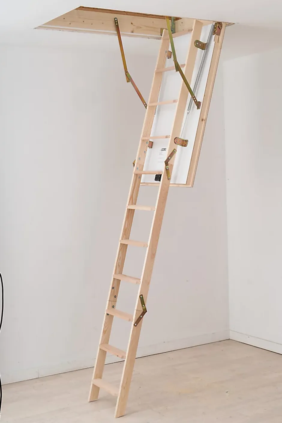 Escalier escamotable en bois pliable à trois plans qui se loge aisément dans l’espace de la porte de la trappe. L’isolation optimale de la trappe garantit l’absence de courant d’air et de perte de chaleur.