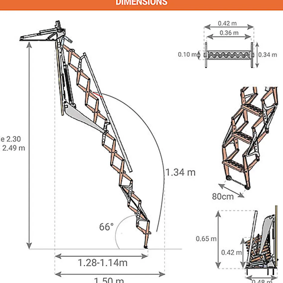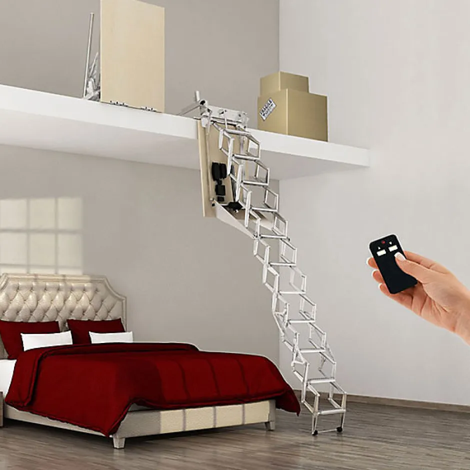 ACCES MURAL- Optimiser les espaces habitables dans un appartement, studio, loft ou maison individuelle.- Agencement et rénovation intérieure pour particuliers ou professionnels.- Travaux de menuiserie facile pour un aménagement sous charpente des combles ou grenier- Escalier motorisé pour agrandir la surface habitable.- Accès aux éléments techniques : gaines électriques, câbles internet, réseau d’eauCONFORT- Marches antidérapantes, 10 x 36 cm.- Faible encombrement en position fermé, avec seulement 48 cm pour un espace optimisé.SECURITE- L’escalier s’arrête immédiatement en cas de choc durant l’ouverture ou la fermeture- Eviter tout risque d’accident lors de la manipulation de l’échelleESCALIER ELECTRIQUE- Alimentation 110/220 V- Livré avec télécommande sur batterie.- Télécommande supplémentaire disponible en accessoires- Disposer de 2 télécommandes en cas de panne ou de perte.- Aucun effort pour l’ouverture et la fermeture, en un clic l’échelle se plie et se déplie.TRAPPE ISOLANTE- Panneau magnetique en contrplaqué d’épaisseur 16mm avec visserie de fixation.- Conserver une bonne température sans refroidisssement depuis les combles ou le grenier.- Le panneau peut être peint pour s’adapter à votre environnement et se fondre dans votre décoration.MONTAGE FACILE- Insérer la trappe dans l’ouverture et fixer à l’aide des platines de fixation en L.- Pose sur béton ou bois : épaisseur de mur miminale de 15 cm.- Ne pas fixer l’échelle sur du placo- Echelle livrée avec notice de montage.ACCESSOIRES – Main courante possible pour une sécurité renforcée : à droite ou à gauche ou des 2 côtés.Les accessoires et les options ne sont pas fournis avec le matériel, veuillez nous contacter pour plus de renseignements