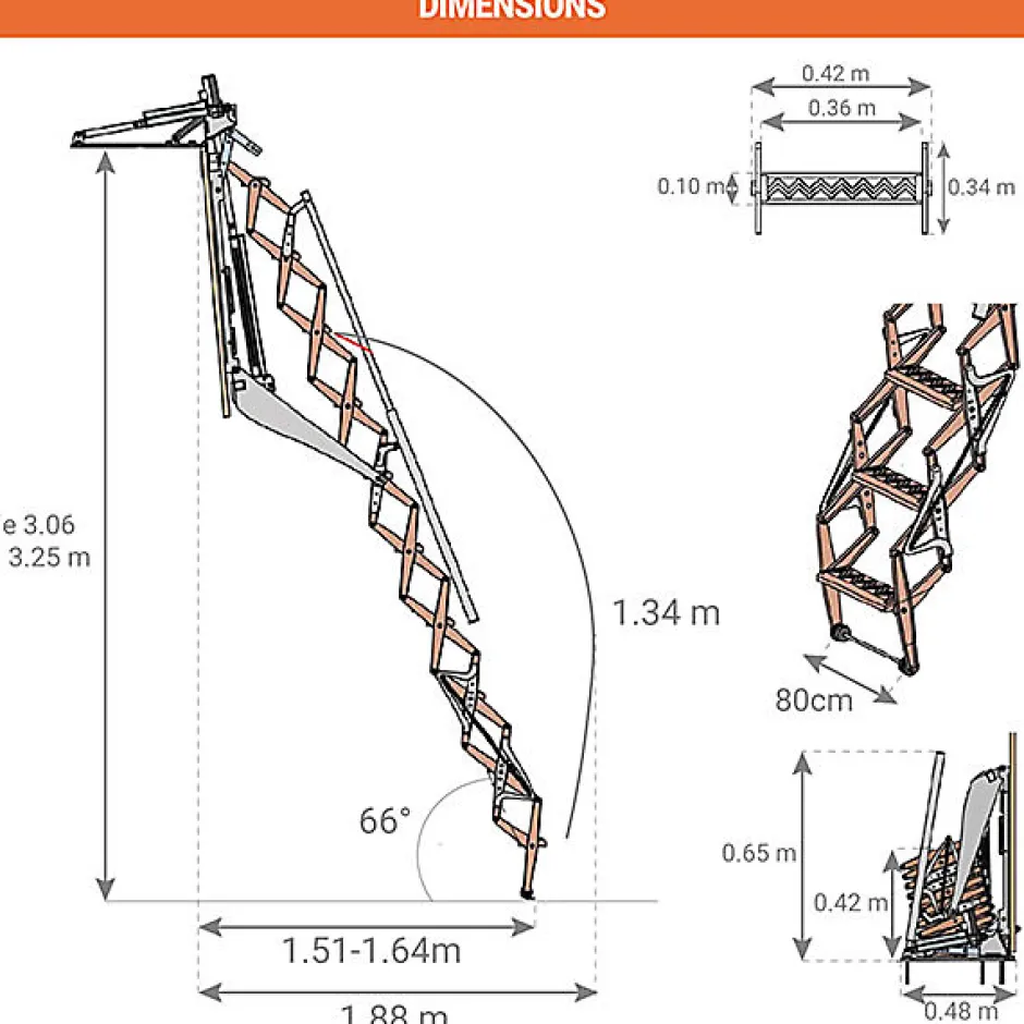 ACCES MURAL- Optimiser les espaces habitables dans un appartement, studio, loft ou maison individuelle.- Agencement et rénovation intérieure pour particuliers ou professionnels.- Travaux de menuiserie facile pour un aménagement sous charpente des combles ou grenier- Escalier motorisé pour agrandir la surface habitable.- Accès aux éléments techniques : gaines électriques, câbles internet, réseau d’eauCONFORT- Marches antidérapantes, 10 x 36 cm.- Faible encombrement en position fermé, avec seulement 48 cm pour un espace optimisé.SECURITE- L’escalier s’arrête immédiatement en cas de choc durant l’ouverture ou la fermeture- Eviter tout risque d’accident lors de la manipulation de l’échelleESCALIER ELECTRIQUE- Alimentation 110/220 V- Livré avec télécommande sur batterie.- Télécommande supplémentaire disponible en accessoires- Disposer de 2 télécommandes en cas de panne ou de perte.- Aucun effort pour l’ouverture et la fermeture, en un clic l’échelle se plie et se déplie.TRAPPE ISOLANTE- Panneau magnetique en contrplaqué d’épaisseur 16mm avec visserie de fixation.- Conserver une bonne température sans refroidisssement depuis les combles ou le grenier.- Le panneau peut être peint pour s’adapter à votre environnement et se fondre dans votre décoration.MONTAGE FACILE- Insérer la trappe dans l’ouverture et fixer à l’aide des platines de fixation en L.- Pose sur béton ou bois : épaisseur de mur miminale de 15 cm.- Ne pas fixer l’échelle sur du placo- Echelle livrée avec notice de montage.ACCESSOIRES – Main courante possible pour une sécurité renforcée : à droite ou à gauche ou des 2 côtés.- Télécommande supplémentaire pour en disposer de 2 en cas de perte ou de panne.Les accessoires et les options ne sont pas fournis avec le matériel, veuillez nous