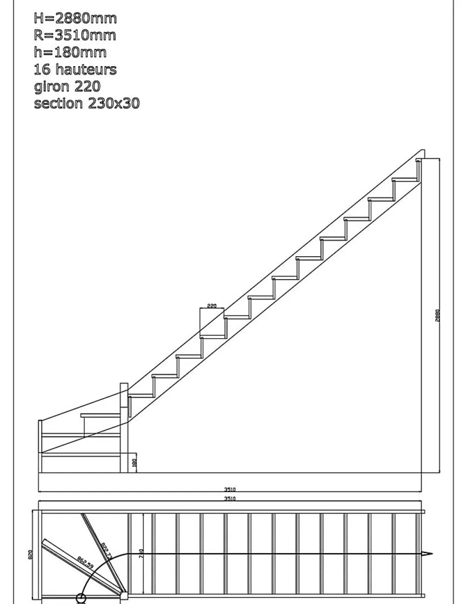 Escalier quart tournant livré en kit, hauteur 288 cm. 15 marches, largeur 80 cm, trémie conseillée 820 x 3510 mm (sans rampe). Disponible avec ou sans contremarches et rampe.