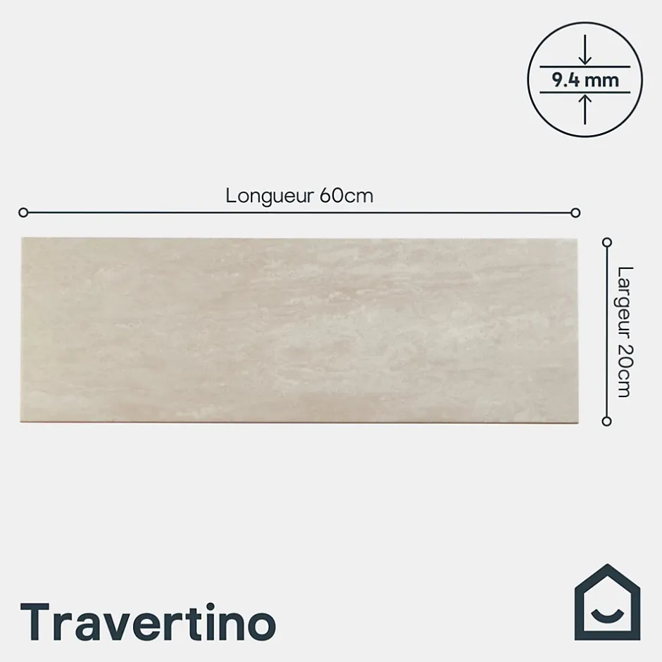 Le carrelage intérieur GoodHome Soft Travertin ivoire mat (600 mm x 200 mm) apportent élégance naturelle et une finition pierre à vos murs intérieurs. Fabriqués en céramique émaillée, ces carreaux mat nécessitent un joint de 4 mm minimum pour une pose stable et sécurisée. Parfaits pour couvrir un seul mur ou pour recouvrir entièrement une pièce, ils combinent style sophistiqué et durabilité. Leur rendu pierre lisse et uniforme permet de créer des intérieurs modernes, élégants et accueillants. Faciles à entretenir, ces carreaux offrent une solution pratique et esthétique pour tous les espaces intérieurs contemporains.