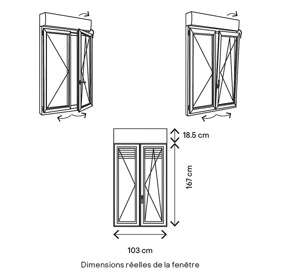 - Dimensions réelles hors tout : l.103 x h.185,5 cm