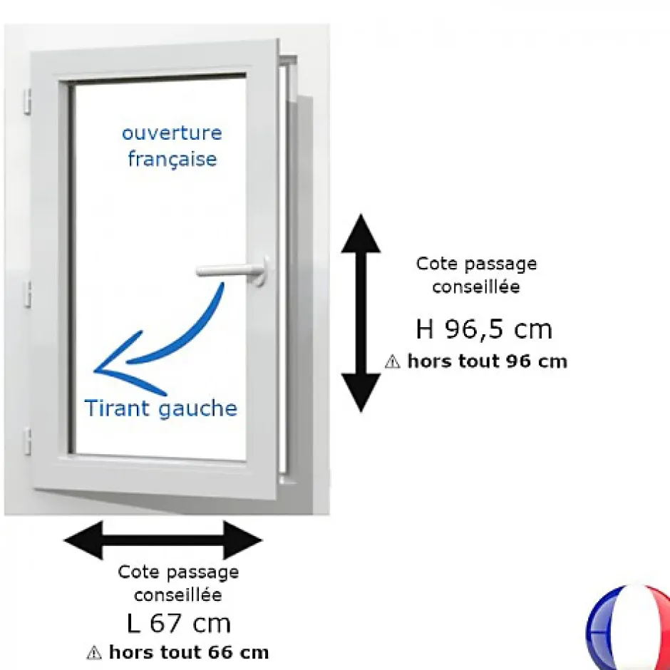 Cette fenêtre PVC 1 vantail de dimensions hors tout H 96 x L 66 cm est idéale pour vos projets de rénovation. Livrée avec un kit complet de cornières de finition, elle permet une pose simple et propre sans dépose complète de l’ancien dormant. Son vitrage performant et son profil REHAU à 5 chambres garantissent une excellente isolation thermique et acoustique, tout en assurant une grande durabilité dans le temps.Dans le détail :- 1 vantail- Pose en rénovation avec son kit- Couleur : Blanc RAL 9016- Dimensions hors tout : H 96 x L 66 cm- Dimensions de passage conseillées : H 96.5 x L 67 cm (ajout de 0.5 cm en hauteur et 1 cm en largeur aux dimensions hors tout)- Détail du kit rénovation : 4 cornières verticales + 3 cornières horizontales + 1 cornière pour la partie inférieure côté extérieure + clips- Type d’ouverture : ouverture à la française- Gamme PVC : REHAU, 5 chambres d’isolation- Oscillo-battant : non- Épaisseur du dormant : 60mm- Épaisseur de l’ouvrant : 77 mm- Épaisseur vitrage : 28 mm (4/20/4)- Intercalaire du vitrage : Warmedge- Vitrage CEKAL, faible émissivité avec gaz Argon- Finition du verre : transparent- Pare closes : droit- Classement AEV : A*4 E*9AV*A3- Coefficient Thermique UW : 1,2 W (m2.K)- Performance acoustique : Rw = 34 db- Certification CSTB : oui- NF : oui- Garantie PVC et vitrage : 5 ans- Garantie quincaillerie : 2 ans- Poignée PVC blanche laquée fournie avec 2 vis (entraxe 44 mm, carré 7 mm de côté, longueur carré 35 mm)