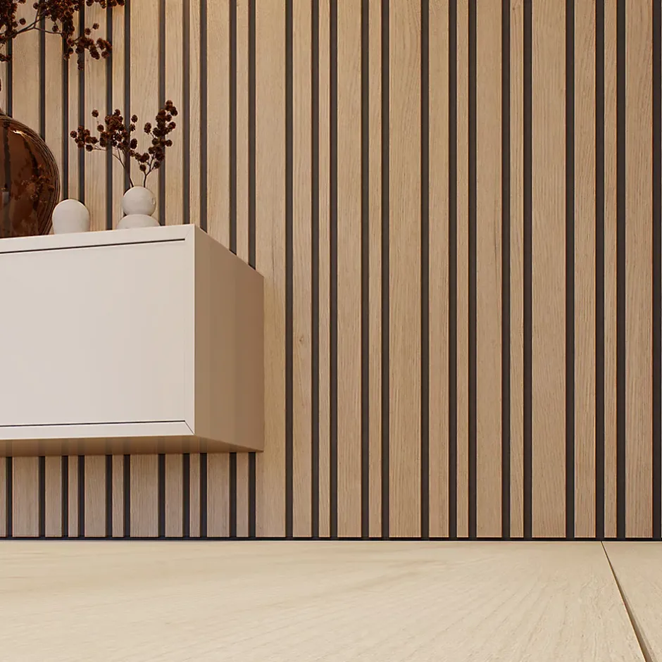 Lot de 2 panneaux tasseaux acoustiques – MDF sur feutrine acoustiqueDimensions (unité) : 2600 x 300 x 17 mm – 0,78 m² par panneau (1,56 m² pour le lot)Épaisseur : 17 mm (lamelles 12 mm – feutrine 5 mm)Livraison : sur RDV au pied de l’immeublePose facile – Mur ou plafondUn habillage mural acoustique haut de gammeCe lot de 2 panneaux acoustiques en tasseaux MDF sur feutrine offre un rendu visuel moderne et raffiné, idéal pour tout type d’intérieur.Leur design déstructuré à lamelles dépareillées apporte du relief et du caractère à vos murs et plafonds tout en améliorant l’acoustique de la pièce.Esthétique et performance sonoreCes panneaux sont conçus pour réduire la résonance et améliorer le confort acoustique dans les pièces de vie, les bureaux ou les espaces professionnels.Leur style s’adapte aussi bien aux ambiances contemporaines, classiques, que scandinaves ou industrielles.Installation simple et rapidePose verticale ou horizontale, mur ou plafond. Fixation par colle ou vis. Facilement découpables à la scie ou au cutter pour s’adapter à toutes les configurations.Convient aux surfaces irrégulières. Profilés d’extrémité assortis disponibles pour une finition parfaite.Utilisation : panneau mural décoratif, plafond, habillage acoustique, lambris intérieurSurface couverte : 1,56 m² (lot de 2 panneaux)