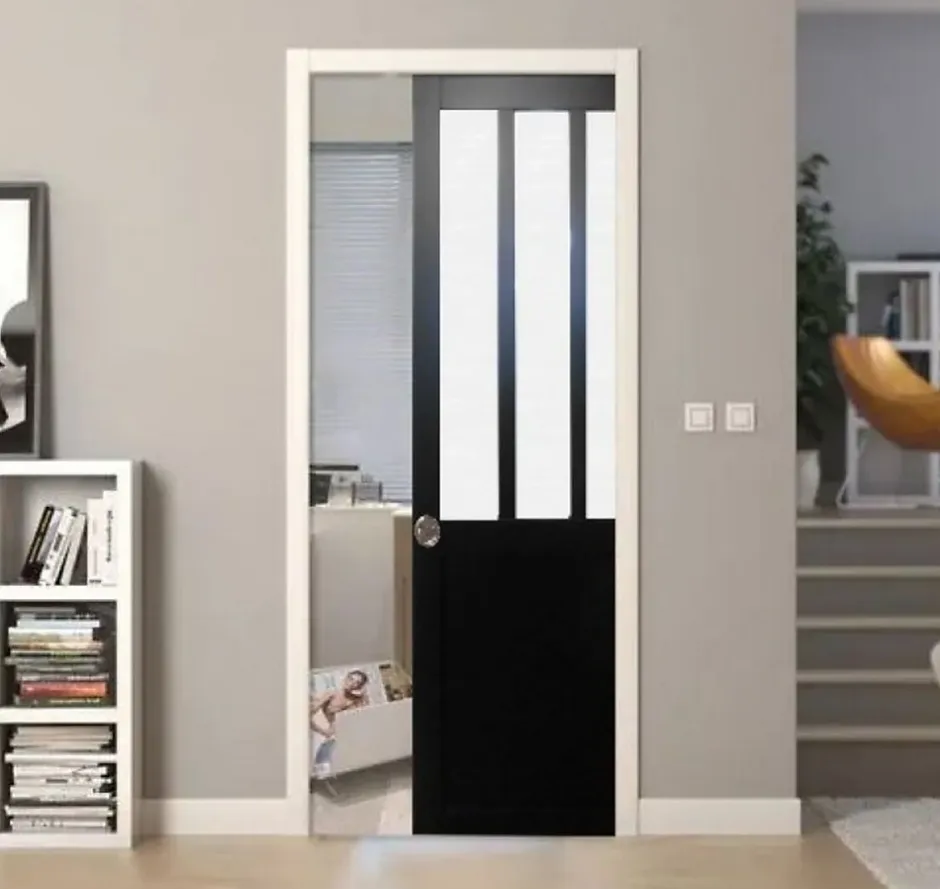 Porte coulissante Atelier Noir vitree depoli securite H204 x L73 avec systeme a galandage et kit de finition inclusLa porte coulissante Atelier Noir vitree depoli, associee a un systeme a galandage avec kit de finition inclus, est ideale pour structurer vos espaces interieurs avec elegance tout en preservant l’intimite. Fabriquee en MDF enrobe noir et conçue en France, elle est equipee d’un vitrage depoli de securite de 4 mm, permettant une diffusion douce de la lumiere sans vis-a-vis.La porte, de H 204 x L 73 cm, dispose d’un ouvrant de 40 mm d’epaisseur, garantissant robustesse et stabilite. Elle est dotee d’un rainurage pour le guidage de l’ouverture coulissante ainsi que d’une serrure a condamnation, offrant confort d’utilisation et fonctionnalite au quotidien.Le systeme a galandage, prevu pour une porte bois de 204 x 73 cm, permet la disparition totale de la porte dans la cloison pour un gain de place optimal. Il est compose d’un chassis metallique en acier galvanise avec montants nervures renforces, assurant rigidite et durabilite. Le coulissement est fluide et silencieux grace a une technologie sur roulements a billes avec butee de fin de course. Le systeme autorise la fixation directe des plaques de platre BA13, presente une epaisseur de 75 mm compatible avec des cloisons de 95 a 100 mm, et necessite une reservation mur de 2110 x 1500 mm. La porte est montee en fin de chantier, le systeme etant conçu pour une porte de 40 mm d’epaisseur.Le kit de finition inclus, livre brut, comprend un montant large cote fermeture, deux joints amortisseurs, deux traverses hautes, deux montants etroits cote ouverture et un joint brosse, garantissant une finition soignee et harmonieuse.Cet ensemble est destine exclusivement a une installation interieure, dans un espace chauffe et isole, et constitue une solution ideale pour les amenagements contemporains recherchant gain de place, intimite et esthetique atelier.