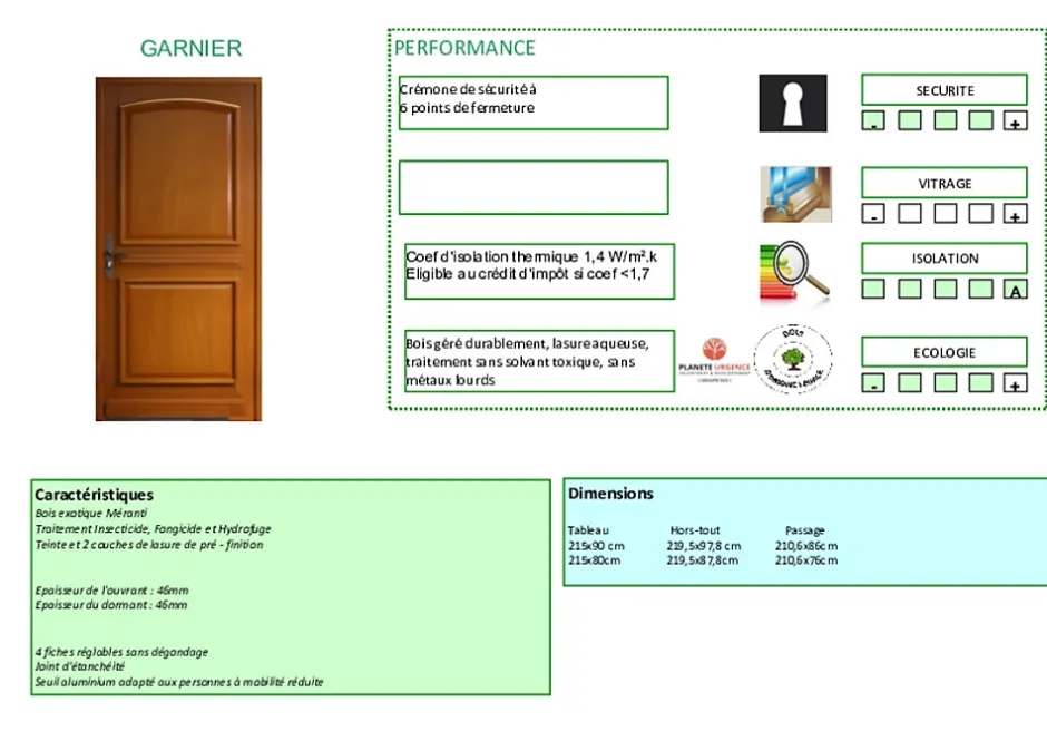 Decouvrez notre porte d’entree en bois pleine, modele Garnier, mesurant 215 cm de hauteur et 90 cm de largeur, (219.6 x 97.8 cm cote totale hors tout) ouverture droite. Cette porte combine esthetique moderne, fonctionnalite et durabilite. Elle represente le choix ideal pour ceux qui recherchent une solution de menuiserie de haute qualite a un prix abordable.