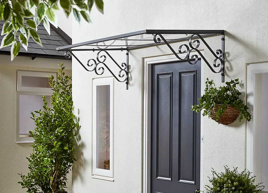 Cet auvent classique aux supports à volutes offre une touche finale à l’entrée de votre maison.