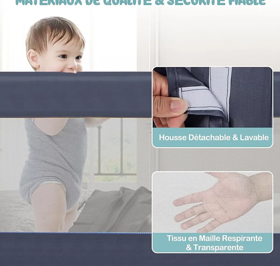 - Assurance de la sécurité de votre bébé: Cette barrière de lit peut empêche votre enfant de tomber accidentellement. La conception de la maille permet à votre bébé d’être toujours dans votre champ de vision. Par conséquent, avec ce dispositif de protection, vous pouvez vous endormir paisiblement et avoir le temps de faire le ménage ou de lire.