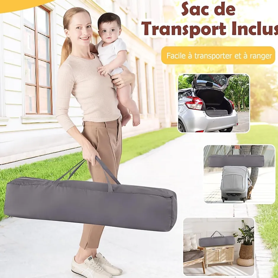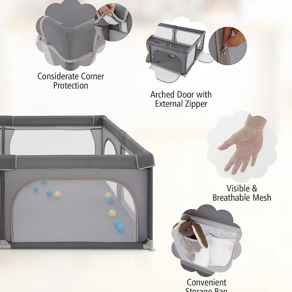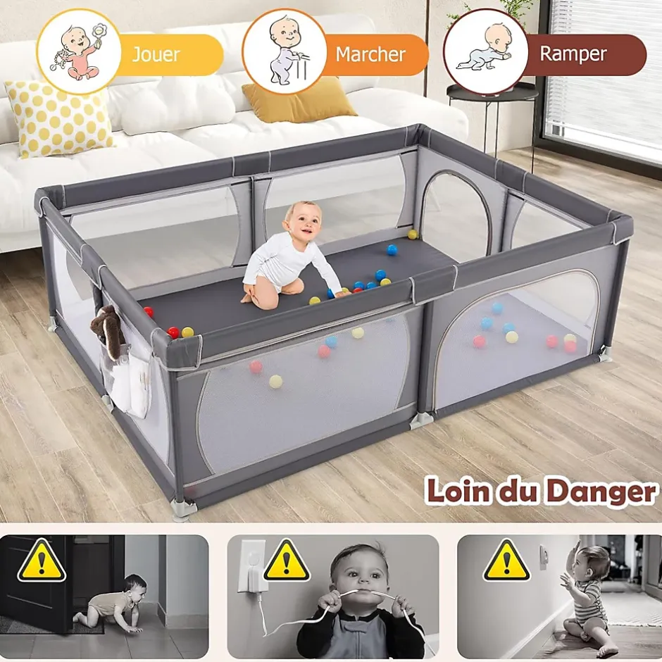 Notre grand parc de jeux pour bébés offre un espace spacieux et sûr pour que votre bébé apprenne à ramper, à marcher et à jouer joyeusement, l’aidant ainsi à grandir en bonne santé et dans la joie. Fabriqué en tissu Oxford résistant, avec un cadre métallique robuste et un filet respirant, ce parc pour bébés de haute qualité est sûr. La porte zippée facilite l’entrée et la sortie des bébés, tandis que les poches de rangement permettent aux parents de stocker les couches, les lingettes et d’autres articles. En outre, il peut être démonté et mis dans un sac de transport pour un rangement facile.