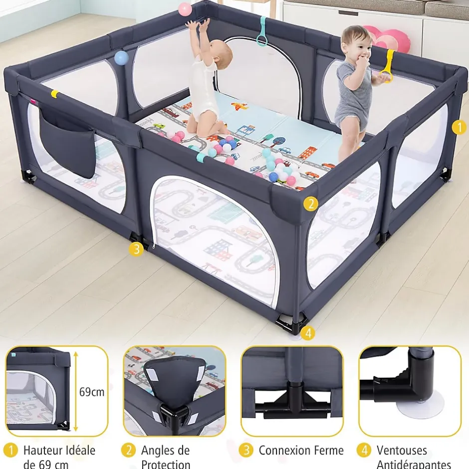- Sécurité Améliorée : Le parc est fabriqué avec des matériaux sûrs et soutenu par un cadre métallique robuste, offrant aux enfants une aire de jeu sécurisée. De plus, la surface antidérapante et les ventouses antidérapantes améliorent considérablement la stabilité. Et les protections d’angle renforcent la sécurité.