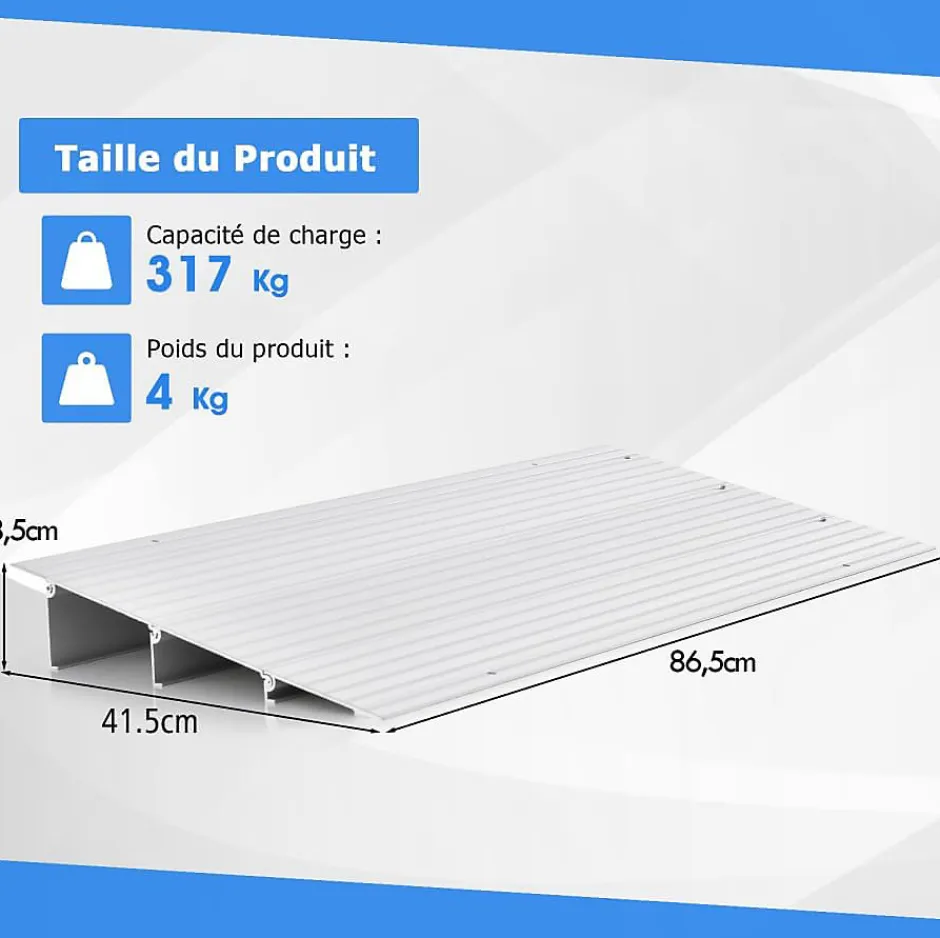 - Cadre en aluminium robuste : Conçue pour résister à une utilisation intensive, cette rampe est fabriquée à partir d’un matériau en aluminium sélectionné qui garantit une durabilité à long terme. Il est résistant aux rayures et peut supporter une capacité de charge maximale de 317 kg, idéal pour le passage d’un diable, d’un fauteuil roulant, d’un véhicule électrique, d’un vélo ou d’une poussette.