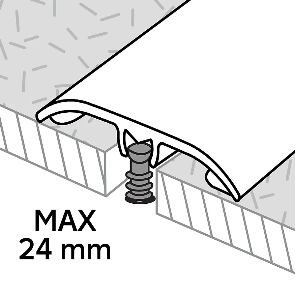 Offrez une finition professionnelle, astucieuse et élégante à votre sol avec cette barre de seuil en aluminium. Cette barre de seuil est idéale pour créer une transition fluide entre deux surfaces au sol de même niveau ou de niveau différent, pour masquer le joint de dilatation et pour protéger les bords bruts exposés des revêtements de sol. Avant de percer, faites attention aux canalisations, aux systèmes de plancher chauffant et aux câbles pouvant passer sous le plancher. En cas de doute, utilisez uniquement le système auto-adhésif pour l’installation. Avant l’installation, nettoyez le sol pour ôter la poussière. Un élément de jonction est inclus afin de relier plusieurs barres de seuil entre elles pour obtenir de plus grandes longueurs. Les cales de dilatation peuvent être utilisées pour installer la barre de seuil en périphérie de pièce le long des murs.