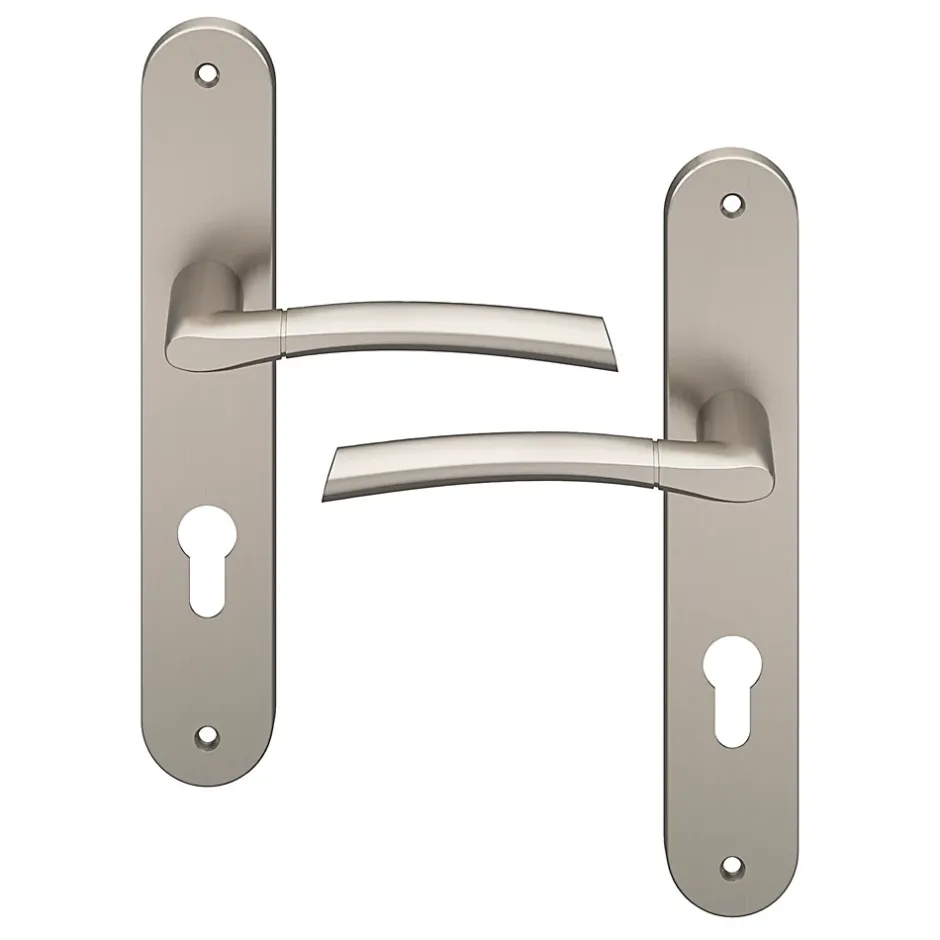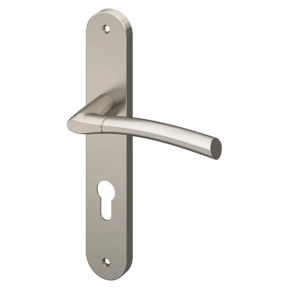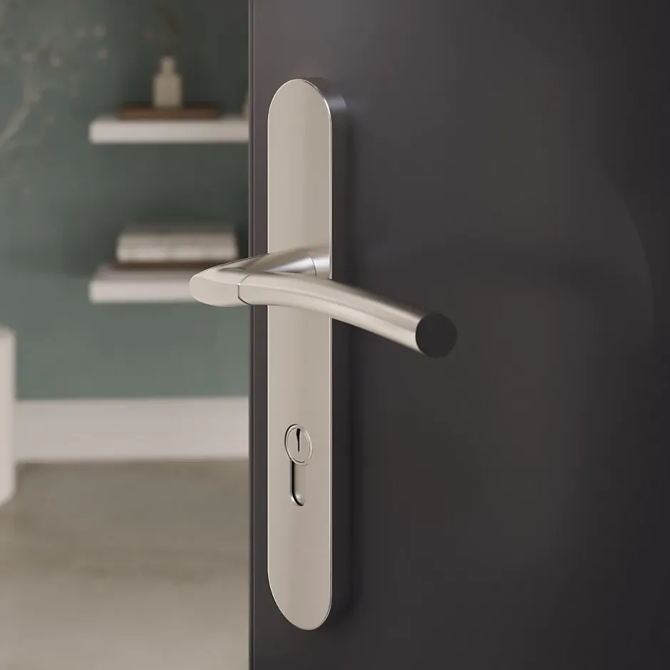 Ensemble poignée sur plaque extérieur rond cylindre GoodHome Hirel effet nickel satin gris chromé L.128mm x l.40mm entraxe 195mm