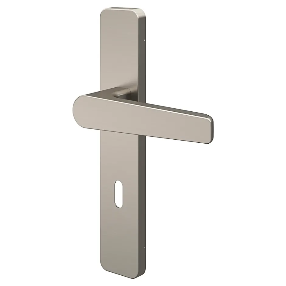 Ensemble poignée sur plaque rectangulaire serrure GoodHome Kerver effet nickel satin gris L.128mm x l.42mm entraxe 165-195mm