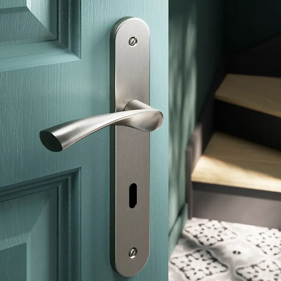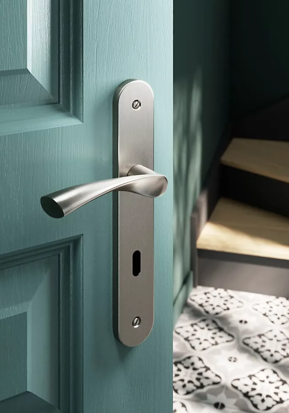 - Poignée de porte tendance sur plaque offrant une touche décorative à votre porte