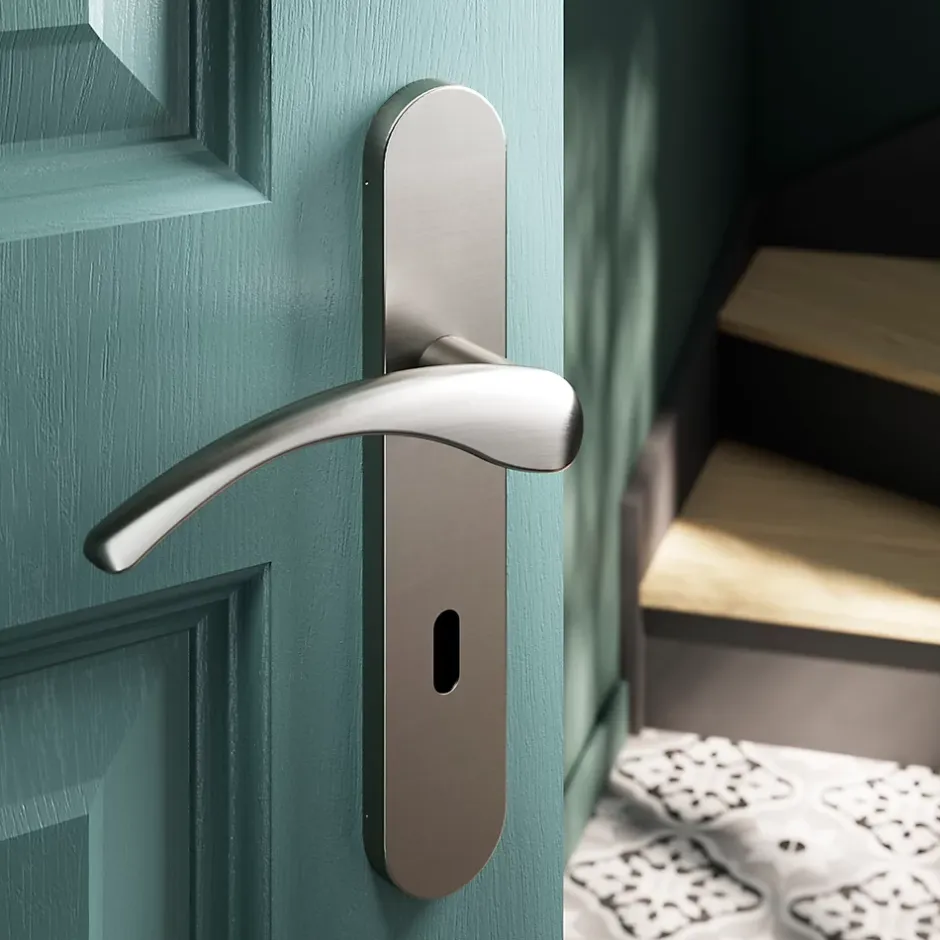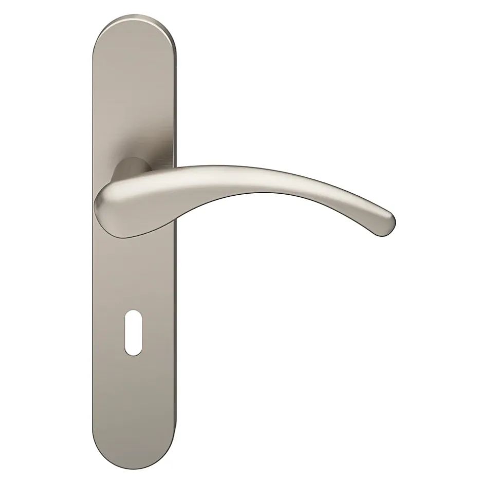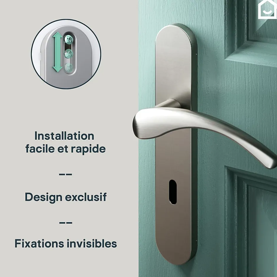 Ensemble poignée sur plaque rond serrure GoodHome Ruis effet nickel satin gris L.138.5mm x l.42mm entraxe 165-195mm