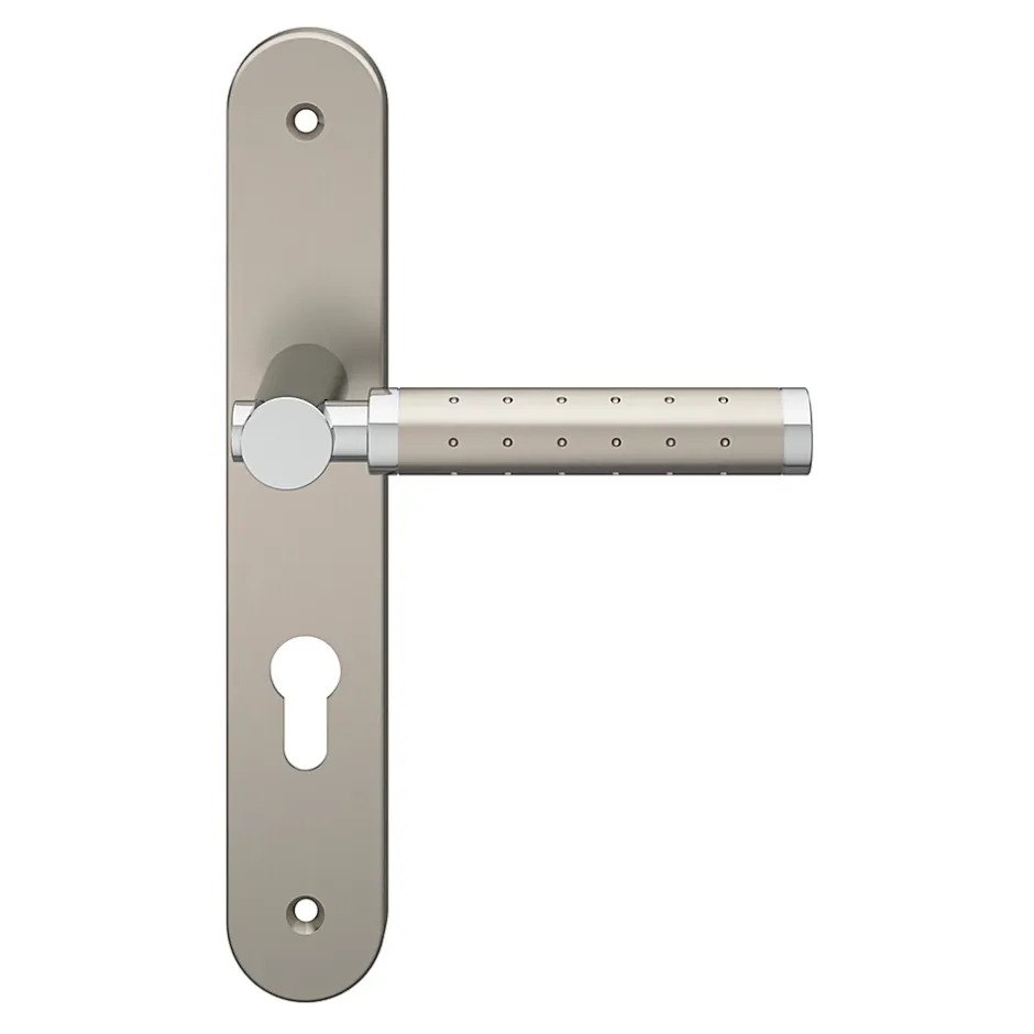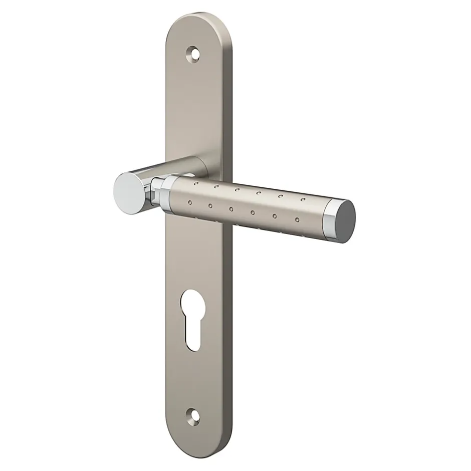 Ensemble poignée sur plaque rondcylindre GoodHome Brigg effet chrome et nickel satin gris L.132mm x l.40mm entraxe 195mm
