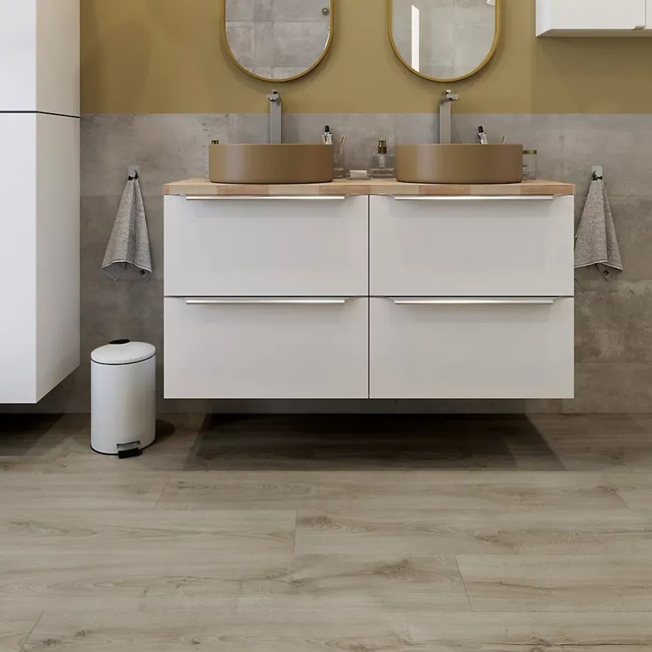 - Ce stratifié est résistant à l’eau et convient donc à toutes les pièces de votre maison, y compris la salle de bain et la cuisine.