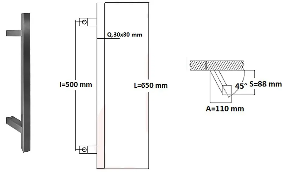 Poignée de tirage Professionnelle – inclinée 45° -Carré 30×30 mm – Entraxe=500 mm – Longueur 650 mm -Hauteur 90 mm – en INOX 304 ( A2) Finition Satinée. Livrée avec 2 fixations simples, traversants la porte et très facile à installer, composées de 2 tiges filetées en fer zinguée de longueur 52 mm x diamètre 8 mm, qui se visse sur une olive en Laiton, bloquée par une vis pointeau latérale dans le tube, M6 mm en inox, s’accouplant dans une bague en Inox, sertis dans le tube de la poignée, et 2 écrous et 2 rondelles.Produit en Italie. Sélectionné pour son excellence par HardwarExchange