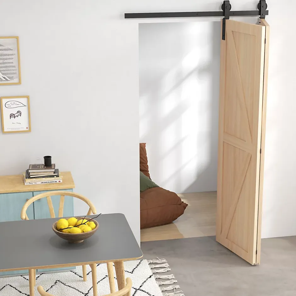 Que vous restauriez une porte de grange, achetiez une porte prête à l’emploi ou construisiez la vôtre, notre kit HOMCOM est essentiel. Il permet d’installer une porte pliable qui glisse doucement, optimisant l’espace dans les couloirs, salles à manger ou chambres. Ce système de rail pour porte pliante est parfait pour vos besoins.Caractéristiques :- Kit de rail pour porte coulissante convient aux portes pliantes- Fabriqué en acier au carbone revêtu de poudre haute résistance pour supporter jusqu’à 90 kg- Les roues de qualité assurent une opération de glissement douce et silencieuse- Rail de porte coulissante design économe en espace, idéal pour les petits espaces- Toute la quincaillerie nécessaire et le manuel inclus pour une installation facileSpécifications :- Couleur : noir- Matériau : acier au carbone- Dimensions totales : 122l x 0,5P x 4H cm- Longueur du rail : 122 cm- Épaisseur de panneau de porte appropriée : 40-55 mm- Largeur max. de feuille de porte unique : 60 cm- Dégagement minimal requis au-dessus de la porte : 10 cm- Charge max. recommandée : 90 kg- Réf. : B81-038V00BK- REMARQUE 😕 Quincaillerie uniquement, porte non incluse? Installation sur des murs en bois (vis autotaraudeuse) ou des murs en ciment (vis à expansion)
