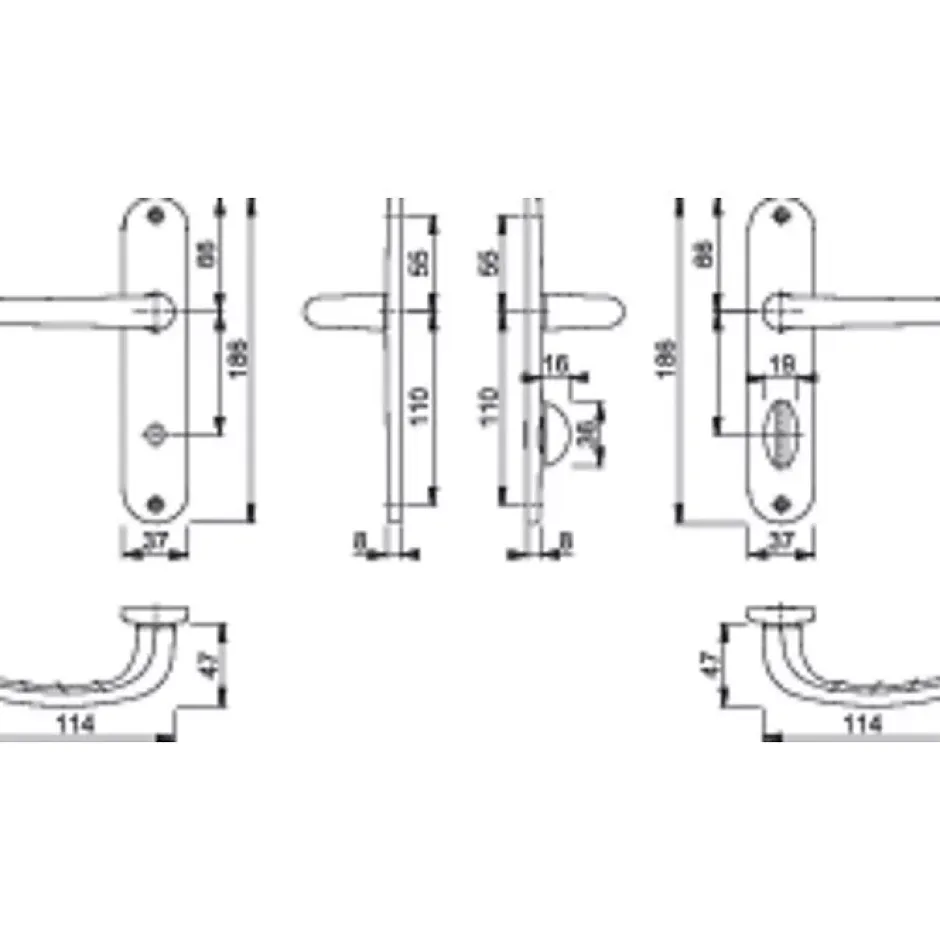 - Dimensions de la garniture adaptées aux portes standard — hauteur plaque 186 mm, largeur 37 mm, longueur de béquille 116 mm, saillie 47 mm.