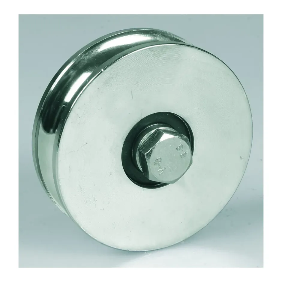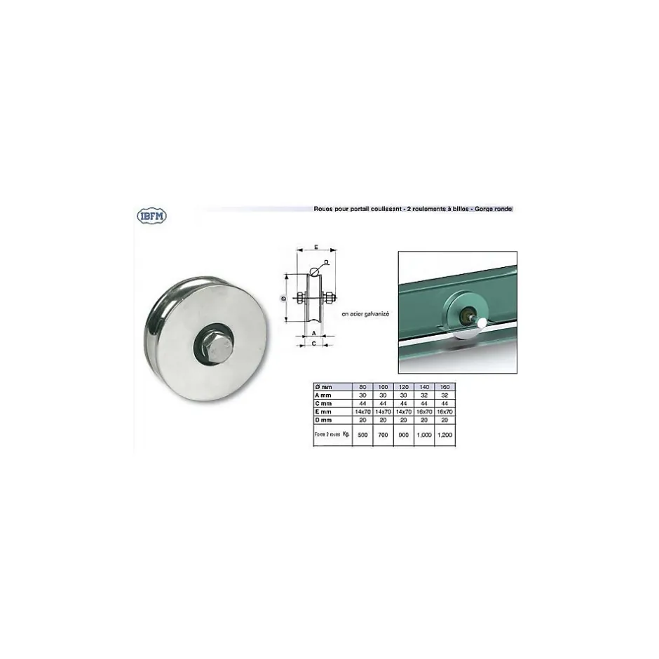 Roue métallique Ø 120 mm avec double roulement à billes et gorge demi-rond, spécialement adaptée aux portails métalliques lourds. Permet l’ouverture des portails actionnés manuellement ou par moteur électrique. Pour un fonctionnement optimal, faites correspondre la forme de la gorge à la piste. Montage discret en créant une ouverture dans le profil inférieur du portail, puis insertion de la roue et des entretoises, et fixation avec le boulon et l’écrou fournis. Après installation, seules la partie inférieure de la roue et les têtes de fixation restent visibles.