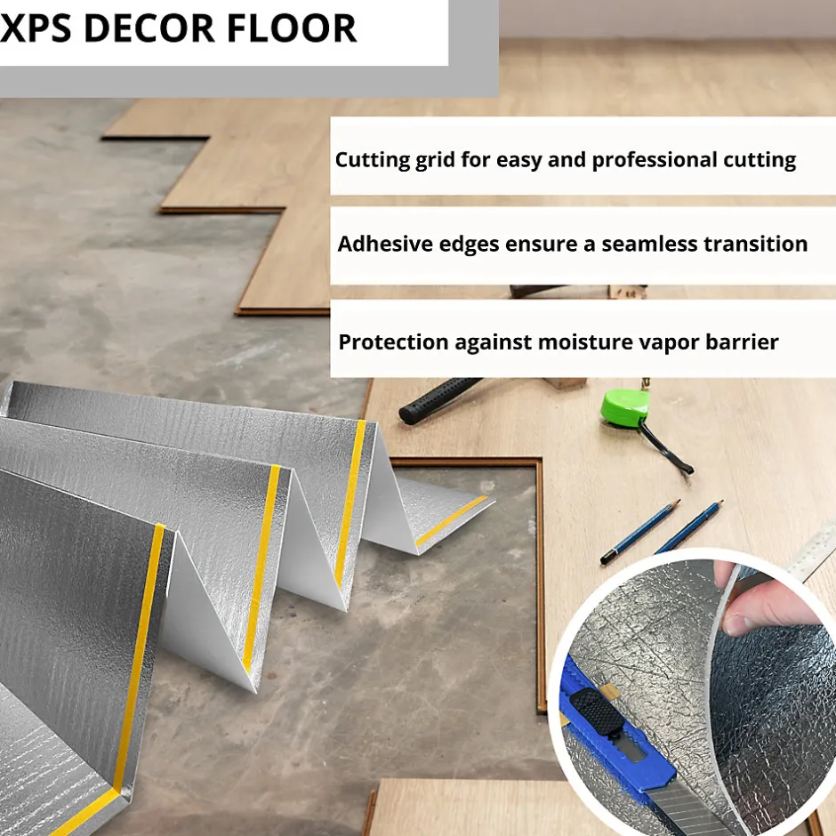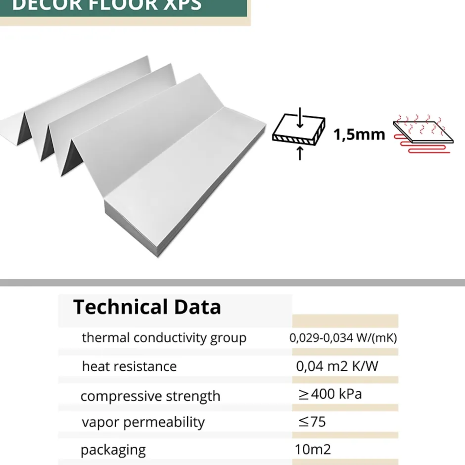 Les sous-couches LVT Decor sont fabriquées en polystyrène extrudé (XPS) selon un procédé de thermoformage. Elles sont destinées à être utilisées dans les bâtiments résidentiels ou publics, à l’exception des pièces humides. Les sous-couches peuvent être utilisées sous les parquets, les revêtements à base de bois, les sols rigides, les panneaux en vinyle LVT et les moquettes.La sous-couche est conçue pour une utilisation avec un chauffage par le sol et sous des panneaux en vinyle clipsables (sols vinyle clic).En cas d’utilisation conforme, le produit ne présente aucun danger pour l’utilisateur.L’isolant doit être posé avec la face argentée vers le sol et la surface en polystyrène vers le haut.Caractéristiques techniques :Épaisseur : 1,5 mm ±10 %Longueur : 10 mètres ±1 %Largeur : 1 mètre ±1 %Densité : 168 kg/m³ ±10 %Résistance thermique : 0,04 m²K/W ±10 %Conductivité thermique : 0,029 – 0,034 W/(mK)Correction des irrégularités du sol : ≥ 0,9 mmRésistance à la compression : 400 kPaPerméabilité à la vapeur : ≤ 75 % ±5 %Charge dynamique : › 100 000 cyclesRésistance aux chocs (objets tombants) : ≥ 125 cm ±5 %Réduction du bruit d’impact : ≤ 17 dB ±5 %Réduction du bruit ambiant : ≤ 14 % ±2 %