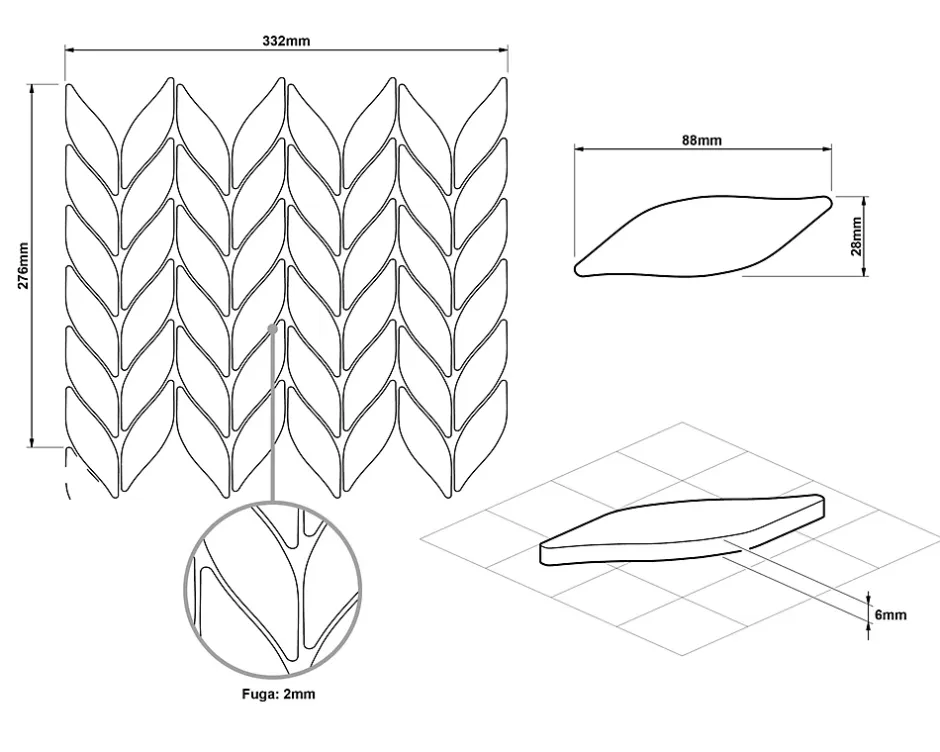 Céramique. Idéal pour une installation murale à l’intérieur, mais aussi excellent pour créer des bandes décoratives et/ou des inserts car il est facile à couper – Il s’adapte à toutes les surfaces, droites et ondulées, également idéal pour les sols. La finition de surface permet un nettoyage facile – L’épaisseur est de 6 mm. Dimensions de la plaque : 27,6 x 33,2 cm ; Nombre de plaques par 1 m2 : 11 ; Certification : ISO 9001 : 2015. 1. Résistant aux hautes températures et aux rayures ; 2. Idéal comme doublure de bain ou de douche; 3. Facile à découper grâce à la maille éco-plastique.