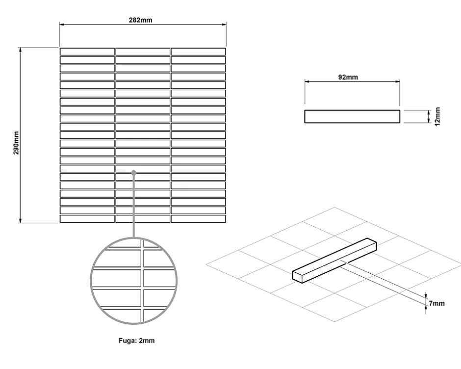 Céramique. Idéal pour une installation murale à l’intérieur, mais aussi excellent pour créer des bandes décoratives et/ou des inserts car il est facile à couper – Il s’adapte à toutes les surfaces, droites et ondulées, également idéal pour les sols. La finition de surface permet un nettoyage facile – L’épaisseur de 7 mm est particulièrement adaptée à la pose en combinaison avec la plupart des carreaux.Taille de la plaque : 29,0 cm x 28,2 cm ;Taille de la carte : 1,2 cm x 9,2 cm ;Nombre de plaques par 1m² : 13 ;Certification : ISO 9001:2015.1. Résistant aux hautes températures et aux rayures ;2. Idéal comme doublure de bain ou de douche;3. Facile à découper grâce à la maille éco-plastique.