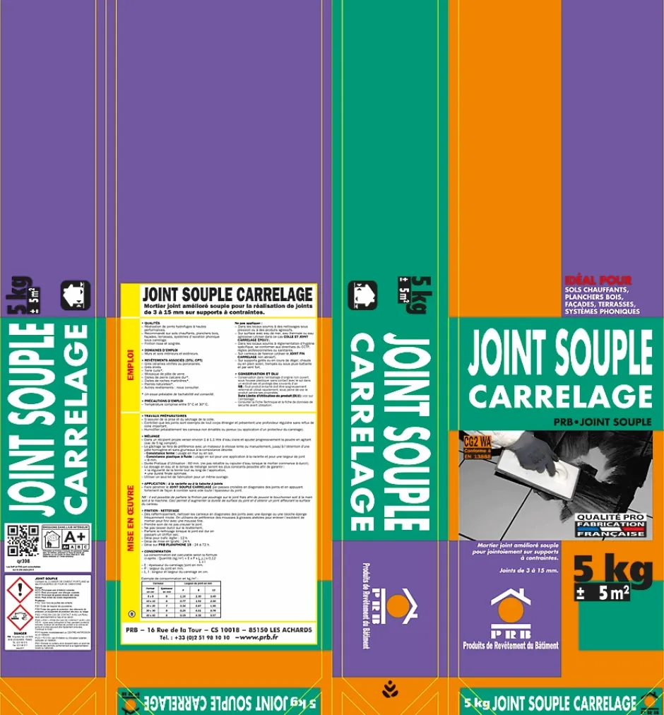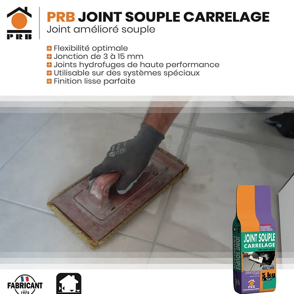 DESCRIPTION DU PRODUITJOINT SOUPLE CARRELAGE – Ce joint souple de haute qualité est spécialement conçu pour l’utilisation sur des surfaces carrelées, offrant une finition propre et durable. Fabriqué en France par PRB, fabricant français reconnu pour la qualité de ses produits techniques du bâtiment. Sa formule souple permet d’assurer une flexibilité parfaite pour l’étanchéité, tout en offrant une résistance accrue aux fissures et à l’humidité. Idéal pour des applications en intérieur, ce produit est parfaitement adapté pour des joints de largeur de 3 à 15 mm.AVANTAGES DU PRODUITLe joint souple PRB est facile à appliquer et à nettoyer, offrant une finition soignée et esthétique. Il est conçu pour résister à l’humidité et aux températures variées, garantissant une durabilité maximale dans des environnements tels que les cuisines, salles de bain ou douches. Sa souplesse permet une meilleure adaptation aux mouvements des matériaux, et il assure une étanchéité optimale. Il est particulièrement recommandé pour des applications nécessitant un joint souple et durable.CARACTÉRISTIQUES TECHNIQUES :- Utilisation : Joint de carrelage souple pour les applications en intérieur.- Composition : Formule souple, résistante à l’humidité et aux fissures.- Dimensions : 40x25x20CM.- Application : Facile à appliquer et à nettoyer.- Autres caractéristiques : Finition soignée, adapté aux environnements humides, idéal pour salles de bain, cuisines et douches.- Conditionnement : Disponible en 5KG et 20KG.- Teintes : 10 Teintes Disponibles.