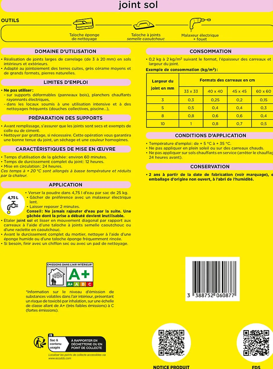 Joint de carrelage spécial sol, de largeur 3 à 20mm
