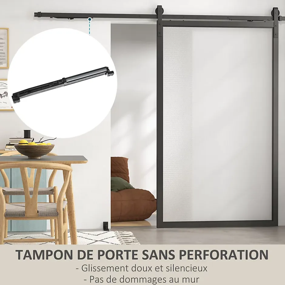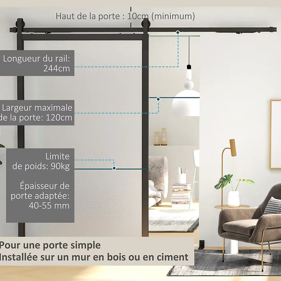 Restaurez ou construisez une porte avec le kit de HOMCOM, conçu pour un coulissement fluide et un gain d’espace optimal. Idéal pour couloirs, garages, salles à manger et chambres. Ce produit efficace répond parfaitement aux besoins de ceux recherchant une telle solution.Caractéristiques :- Les butoirs de porte sans perçage évitent le bruit et les dommages au mur- Kit de rail pour porte coulissante en acier au carbone robuste recouvert de poudre, ils peuvent supporter jusqu’à 90 kg- Des roulettes de qualité assurent un glissement doux et silencieux- Économisez de l’espace avec une porte qui coulisse le long du mur et ne nécessite pas d’espace de rotation- Ce rail de porte coulissante joute de la beauté et un style moderne à votre maison, répondez à vos besoins de bricolage- Incluant tout le matériel nécessaire et un manuel, 2 personnes peuvent terminer l’installation en 0,5 hSpécifications :- Couleur : noir- Matériau : acier au carbone- Dimensions totales : 244L x 0,5l x 4H cm- Longueur d’un rail unique : 122 cm- Épaisseur de panneau de porte appropriée : 40-55 mm- Largeur max. de la porte : 120 cm- Dégagement minimum requis au-dessus de la porte : 10 cm- Charge max. recommandée : 90 Kg- Réf. : B81-039V02BK- NOTE 😕 Seulement la quincaillerie, porte non incluse? Installation sur un mur en bois (vis autotaraudeuse) ou un mur en ciment (vis d’expansion)