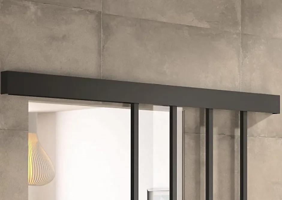Kit porte coulissante atelier noir verre clair avec rail bandeau décor assorti H 204 x 93 x 3,6 cm