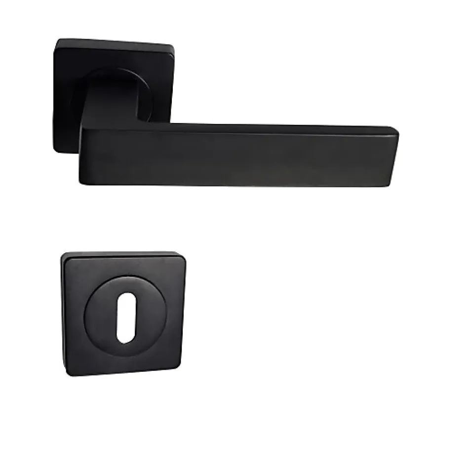 Paire de Poignées de Porte en ALUMINIUM « NATALYA » Noire . Section de la poignée : 24 mm x 8 mm Longueur de la béquille : 124 mm Rosace carrée Noire : 52 mm Carré fendu : 7 mm x 110 mm Ressort de Rappel : Oui Pour porte : de 40 mm à 60 mm Télécharger et/ou imprimer la Fiche Technique disponible ci-dessous !
