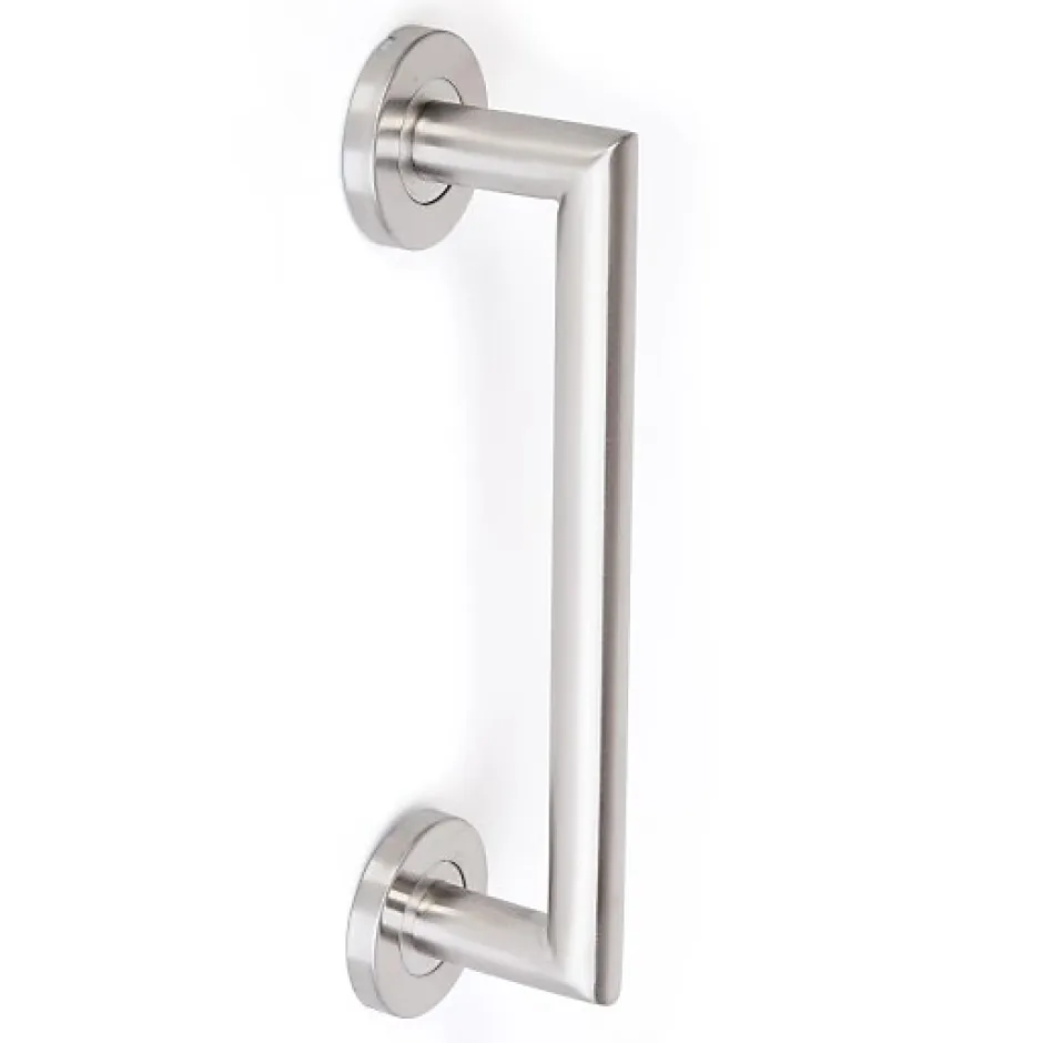 Poignée de tirage facilitant l’ouverture des portes de salles de bain et des toilettes . Marque : Métal : Inox 304 Polissage : Oui Forme poignée : angle vif Rosaces : 2 Diam.rosace : 53 mm Diam. tube : 20 mm Entraxe : 275 mm Saillie : 70 mm vis bois : 6