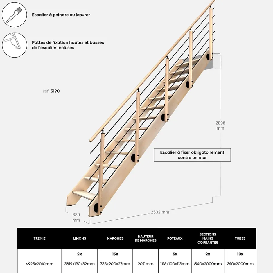 - Livré en kit prêt-à-poser, votre escalier droit peut être installé tel quel, ou lasuré, peint et recoupé selon vos goûts et dimensions de votre pièce. Se pose contre un mur.