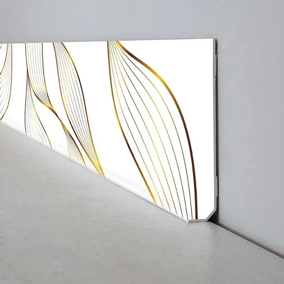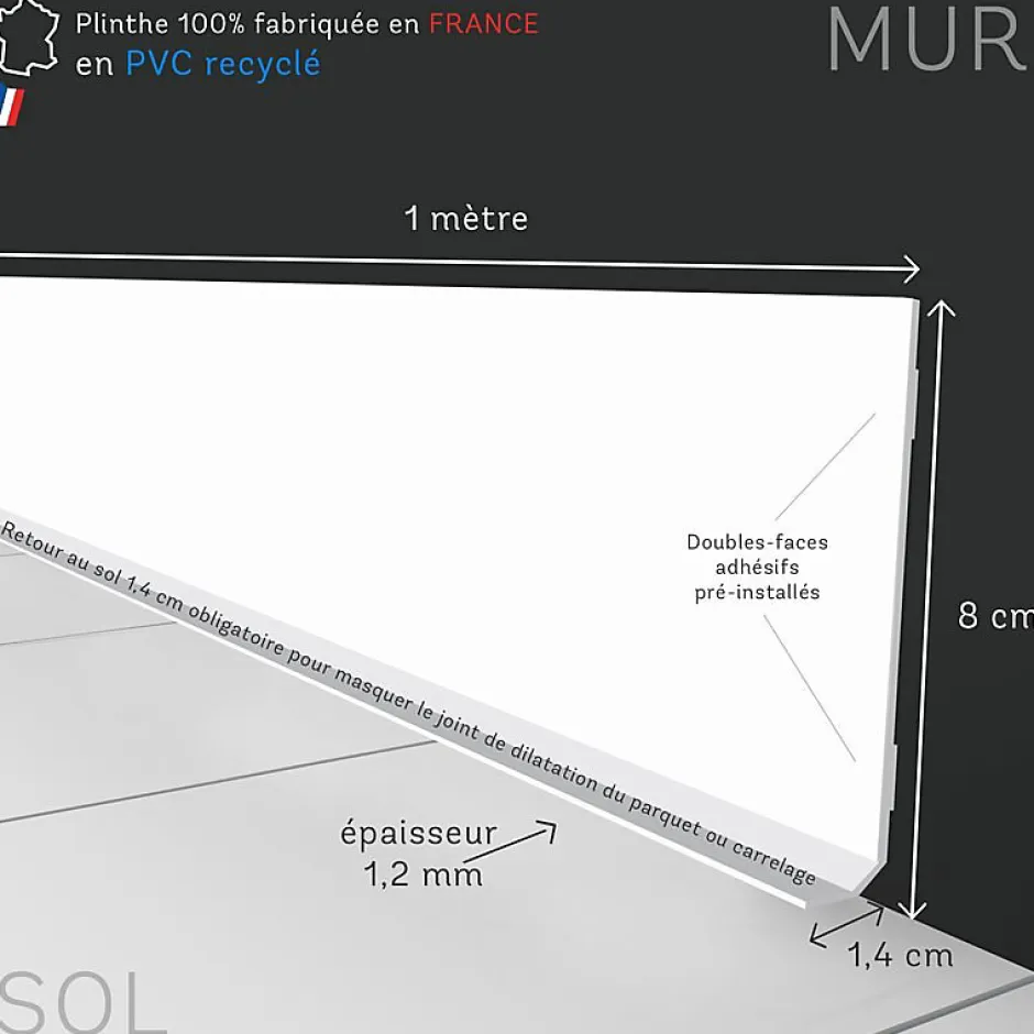 Plinthe en PVC recyclé. Disponible en 1 mètre par lot de 10 ou en 2 mètres par lot de 25.Multi-surfaces : Sol Stratifié, Parquet, Carrelage, Vinyle.Prête à poser : bandes adhésives en polyoléfine de marque TESA préinstallées au dos.Vernis de protection sur le décor.Semi-rigide.Classement au feu M1 (ininflammable). A coller sur votre mur en placoplatre, peinture, toile de verre, ou même vos plinthes existantes, le support doit être propre et dépoussiéré.Fabriqué en France.