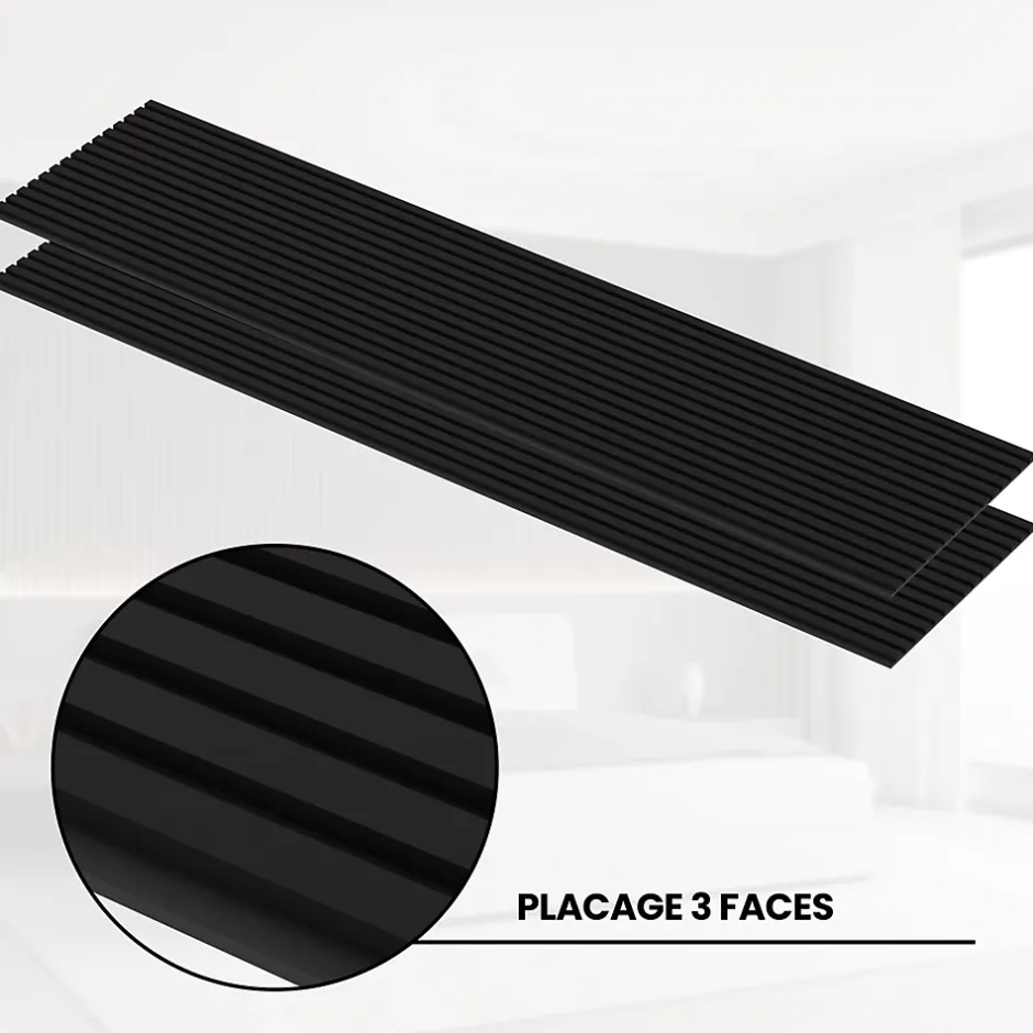 Son revêtement noir élégant apporte une touche contemporaine et sophistiquée tout en absorbant efficacement les nuisances sonores. La combinaison des lattes noires en MDF et du feutre acoustique crée une atmosphère moderne tout en améliorant le confort phonique de la pièce. Sa finition noire profonde met en valeur la décoration intérieure et réduit les échos pour une meilleure qualité sonore. Le contraste du noir avec des murs clairs offre un design haut de gamme et améliore l’acoustique de l’espace. Facile à poser grâce à son format standard, le panneau transforme vos murs en un habillage noir chic tout en réduisant la réverbération. Conçu avec des matériaux robustes et durables, il assure une isolation phonique efficace tout en ajoutant une touche moderne. Son design noir sobre et élégant s’intègre parfaitement dans les intérieurs contemporains tout en rendant la pièce plus confortable acoustiquement. La couleur noire absorbe non seulement le son mais aussi la lumière, créant une ambiance intime et chaleureuse. L’association du noir et du feutre acoustique apporte une double fonction : décoration murale raffinée et amélioration acoustique. Grâce à son style noir intemporel, il s’adapte aussi bien aux espaces professionnels qu’aux intérieurs modernes tout en optimisant l’acoustique.