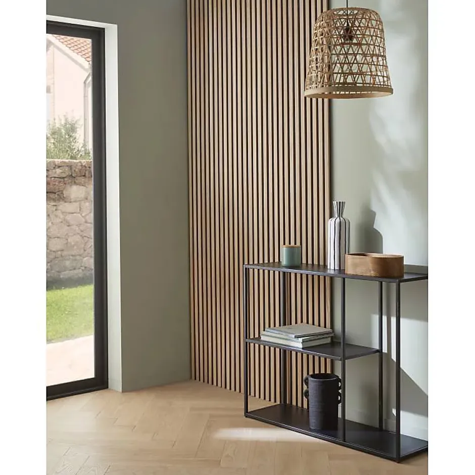 Le mur en tasseau de bois est l’une des dernières tendances dans le monde de la décoration d’intérieur. De plus en plus apprécié par les amateurs de home staging ou les architectes, ils sont désormais accessibles pour tous les amateurs de déco afin de créer un mur TV, une entrée moderne et chic, une tête de lit cocooning ou simplement pour donner une ambiance scandinave design dans votre intérieur. Nous vous proposons ce lot de 2 panneaux afin de moderniser rapidement une entrée, un pan de mur ou de créer une tête de lit en position horizontale.Decoon vous propose une solution tout-en-un, prête à poser avec ce pack produit ultra pratique ! Cette solution de 250 x 30cm d’une épaisseur de 2cm est la solution idéale pour moderniser rapidement et facilement votre intérieur. En un rien de temps, vous apporterez du cachet à votre intérieur tout en créant un décor en tasseaux cosy et chaleureux. Ce pack est composé de 2 panneaux muraux, créant ainsi une surface de 1,5m2 de 60 cm de long sur 250 cm de haut. Derrière son côté minimaliste et épuré, c’est bien plus qu’un simple panneau tasseaux bois : son épaisseur de 2 cm vous offre un confort acoustique amélioré grâce aux propriétés absorbantes de la feutrine.Présentation du panneau tasseau boisCe panneau est composé d’une feutrine noire et de lattes de bois espacées. Il présente une épaisseur totale de 2 cm : 8 mm d’épaisseur de feutrine et 11 mm d’épaisseur de tasseau. Chaque tasseau présente une largeur de 27 mm avec un espacement de 16 mm avec le suivant. Le panneau de tasseaux bois est de dimensions 250 x 30 cm.Chaque tasseau est composé d’une base en MDF revêtu d’un véritable placage en chêne clair. Il présente une section de 27 x 6 mm.Avantages du mur tasseau boisLe